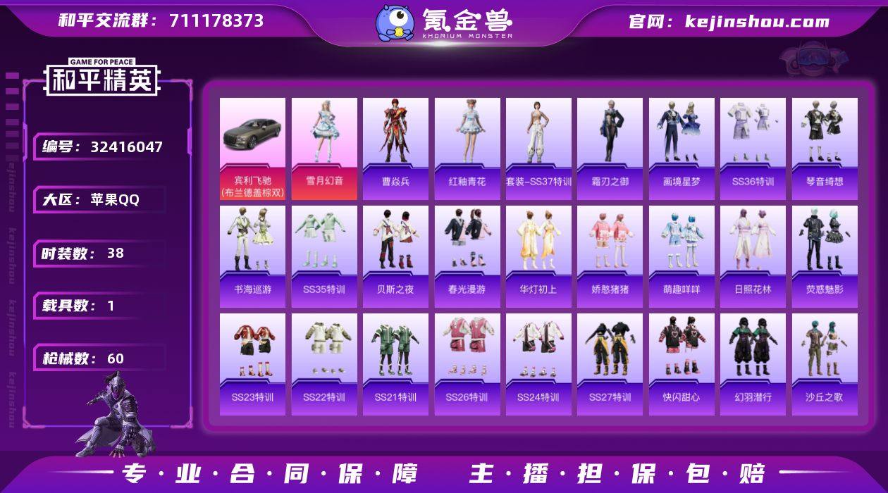 【kyhp864】安卓 手Q-0粉装-7特效枪-0载具-0粉色飞行器-32039热力值-7王牌印记-81套装-116枪皮 【热门品类】:套装-都市猎人,套装-龟仙人,套装-暗影哥特 【粉色枪皮等级】:GROZA-镜光银凌(五级),AUG-暖羊咩咩(五级),ACE32-萌骑漫游(五级),AKS-74U-森灵之息(五级),Kar98K-巳巳如意(五级),Mk14-福马献瑞(五级),DP-28-豹影疾电(五级) 【粉色枪皮】:GROZA-镜光银凌,AUG-暖羊咩咩,ACE32-萌骑漫游,AKS-74U-森灵之息,Kar98K-巳巳如意,Mk14-福马献瑞,DP-28-豹影疾电 【粉色降落伞】:极意拳锋降落伞,炫彩糖果降落伞 【稀有套装】:套装-龟仙人,套装-巳巳如意,套装-马上有钱,套装-雏菊兔兔,套装-萝兰蝴蝶,角色-许七安,套装-燕燕于飞,套装-鱼渊荷华,套装-风舞幻音,套装-书海巡游,套装-画境星梦,套装-琴音绮想,套装-粉彩缠枝,套装-雨过天青,套装-红釉青花 【稀有枪皮】:AUG-冰晶雪宝,AKM-彩虹符号,AKM-影袭,AKM-破晓战魂,AKM-虎虎生威,AKM-龙的传人,M16A4-幻世战舞者,SCAR-L-夜灯,SCAR-L-玉兔迎春,M416-糯团青竹,M416-蓝色火焰,GROZA-彩虹符号,GROZA-影袭,GROZA-田园牧歌,AUG-天降萌叽,AUG-甜蜜菠萝,AUG-耀粉歌者,M762-天降萌叽,M762-奇异狩猎者,AC-VAL-天降萌叽,蜜獾-天降萌叽,ACE32-画境星梦,UZI-啾咪啾咪,UZI-天降萌叽,UZI-影袭,UMP45-夜灯,UMP45-涂山之恋,UMP45-蓝色火焰,Vector-生命誓言,Vector-田园牧歌,汤姆逊-天降萌叽,汤姆逊-炫彩节奏,MP5K-画境星梦,P90-巳巳如意,Kar98K-影袭,Kar98K-红色方程式,M24-影袭,M24-炫彩节奏,SKS-炫彩节奏,SKS-糯团青竹,VSS-彩虹符号,VSS-田园牧歌,Mini14-涂山之恋,SLR-彩虹符号,M1加兰德-画境星梦,S686-巳巳如意,S1897-炫彩节奏,S12K-夜灯,DBS-彩虹符号,AA12-G-画境星梦,SPAS-12-田园牧歌,M249-糯...