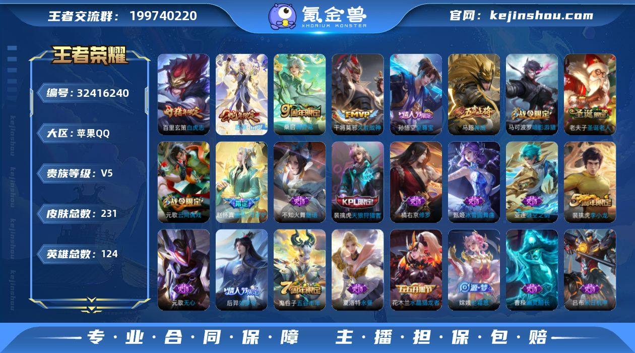 实名: 可修改 贵族等级: V5 英雄数: 124 皮肤数: 231 传说皮: 久胜战神 限定皮: 遇见飞天,李小龙,游园惊梦,梁祝,神威,天狼狩猎者,白虎志,至尊宝,如梦令-后羿,霸王别姬-项羽,圣诞老人,五谷丰年,鸣野蒿,逐霄战戟,愿照·山河定