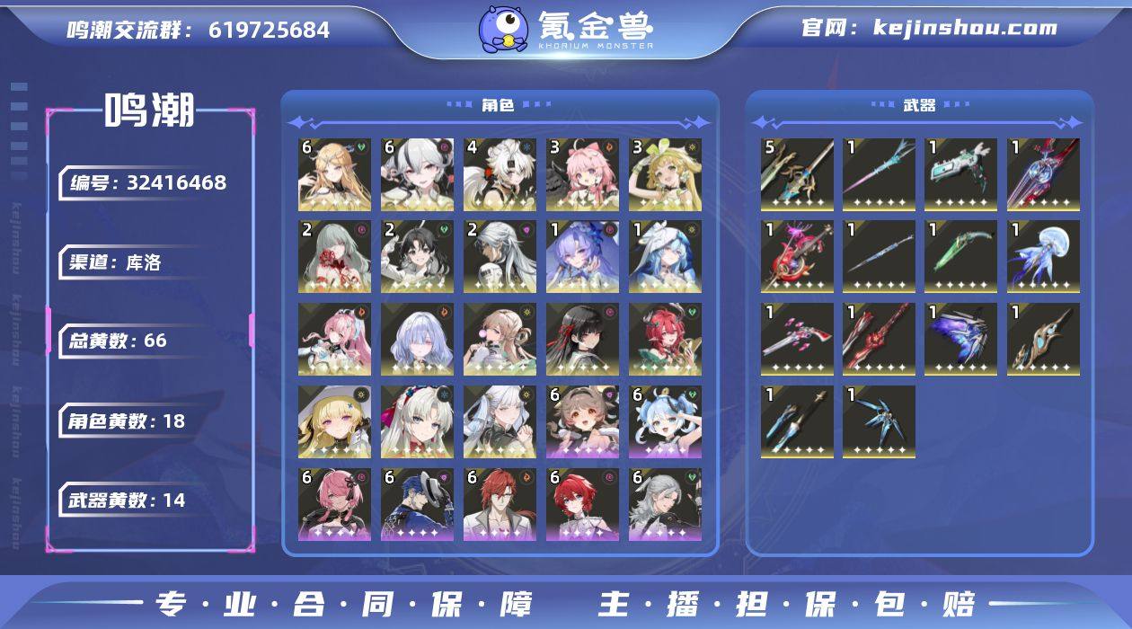 up池小保底70抽,所有角色基本都有一套极品声骸,打深塔海域完全无压力,同时绑定一个几乎所有在岗角色战双号,极品高练度账号