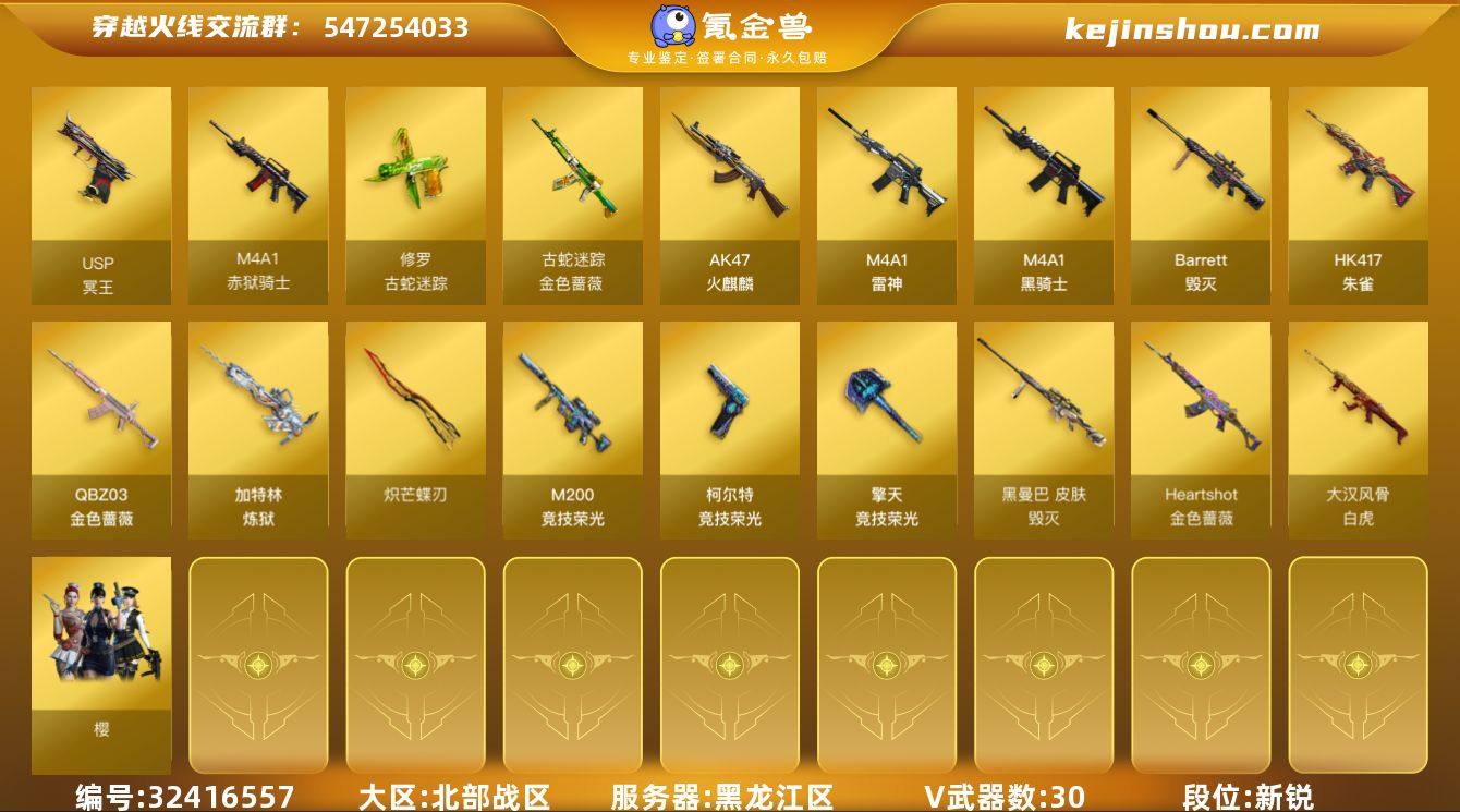 【ky5234】黑龙江区-32V-0王者-0炫金 【热门武器】:QBZ03-金色蔷薇,HK417-朱雀,金色蔷薇-古蛇迷踪,修罗-古蛇迷踪,M200-竞技荣光,M4A1-黑骑士,加特林-炼狱,炽芒蝶刃 【皮肤】:白虎-大汉风骨,金色蔷薇-Heartshot皮肤,毁灭-黑曼巴 皮肤,毁灭-虹光风暴 皮肤,毁灭-英雄计划 皮肤,幻影-破浪逐光 皮肤 【角色】:樱,蛇隐宗,乔伊教练,潘多拉-X,潘多拉-甜心教官,蛇姬,斯沃特-X 【人偶武器】:生化手雷-机甲核心*2,Barrett-夜玫瑰,灵狐娃娃手雷*2 【挑战大师】:冰龙粉碎者-白马银枪,激光毁灭者III-白马银枪 【英雄级武器】:AK47-火麒麟,M4A1-雷神,M4A1-黑骑士,HK417-朱雀,金色蔷薇-古蛇迷踪,QBZ03-金色蔷薇,Barrett-毁灭,M200-竞技荣光,加特林-炼狱,柯尔特-竞技荣光,USP-冥王,修罗-古蛇迷踪,擎天-竞技荣光*3,炽芒蝶刃,丛林匕首-玄豹,高爆手雷-竞技荣光*4,高爆手雷-古蛇迷踪,高爆手雷-玄豹,闪光弹-竞技荣光*2,闪光弹-玄豹,烟雾弹-竞技荣光*3,烟雾弹-古蛇迷踪,烟雾弹-玄豹,M4A1-赤狱骑士 【道具】:CFS限定背包,云山科技背包,亚洲杯纪念炫彩背包,古蛇迷踪炫彩背包,炫彩背包,超级背包,迷你冰龙背包,女皇终结者-魔龙之吻,救世主-黑...