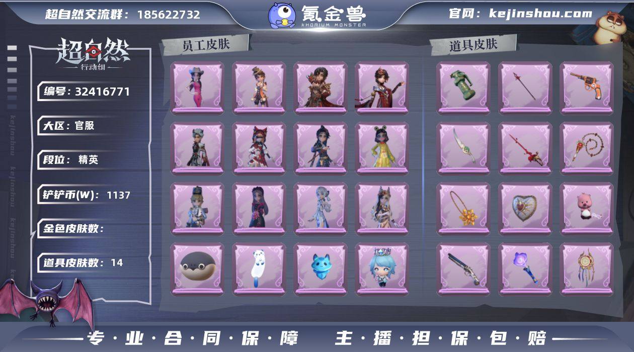 金皮3;紫皮5;道具皮20;皮肤:巫铃儿-镜花辞,零-渡鸦公爵,薇薇安-圣光之谕,爱丽丝-丝缕哀歌,逍遥-绣春逍影,莉莉-情公主,小黄-呱呱雨衣,爱丽丝-耀眼的你;道具:喷气背包-乘风溯雪,额外的背包-飞花令,摸金符-祝祷词,急救包-蔷薇物语,桃木剑-绯色遗证,刺刀-碧络琅环,腰包-宝剑八,闪光弹-金戈玄铜,急救包-末章心跳,铲子-龙鳞,短管猎枪-赞萌露比水枪,长鞭-小狗蛇点点鞭,桃木剑-凤鸣九天,转轮手枪-新星时代,电击枪-甜蜜泡泡枪,音响-happy猫,音响-鸣沙鼓,铲子-圣心之泪,传送按钮-昆仑镜,传送按钮-逆时审判;美妆:美妆-暗夜小恶魔;饰品:头饰-火爆了头套,头饰-太空鲨头套,头饰-滑稽头套,头饰-雪墩墩头套,头饰-蒜了八,头饰-精致露比头套,头饰-大葱明头套,头饰-嘻嘻头套,头饰-面具马头套,头饰-萨卡班甲鱼头套,头饰-小狗蛇点点头套,头饰-呆滞头套,头饰-鱼头怪头套,头饰-炙热烧烤,头饰-咬咬鲨头套,头饰-哈士奇头套,头饰-卑微头套,头饰-樱桃奶油布丁,头饰-惊魂南瓜头套,头饰-烈焰红唇头套,头饰-像素朋克墨镜,头饰-后室幸存者头套,挂饰-钗头凤,挂饰-天使消失的年代,挂饰-糖果守卫,挂饰-尘封旧事,背饰-蝶恋花,背饰-绒团小狐狸,背饰-天使的呼唤,背饰-子夜证词;动作:动作-孤身摇,动作-心跳摇,动作-DL摇,动作-七仔摇,动作-小雨摇,动作-luvaboy,动作-鹏友摇,动作-舞台中心,动作-要糖,动作-举牌,动作-抬手,动作-KT猫摇;工牌背景:工牌背景-卷珠帘,工牌背景-雷霆轩,工牌背景-复活的肖像,工牌背景-蓝海奇遇,工牌背景-圣光之誓,工牌背景-心同野鹤,工牌背景-点点萌伴,工牌背景-永夜巡礼,工牌背景-粉嫩小海狸,工牌背景-童话扉页;工牌动作:工牌动作-鸦影,工牌动作-虔诚之姿,工牌动作-元气剪刀手,工牌动作-净禅;员工:爱丽丝,小满,兰,小黄,莉莉,阿念,艾伦,巫铃儿,逍遥,零,薇薇安,爱德华;累充1973元;铲铲币110.7万;金砖0;段位:...