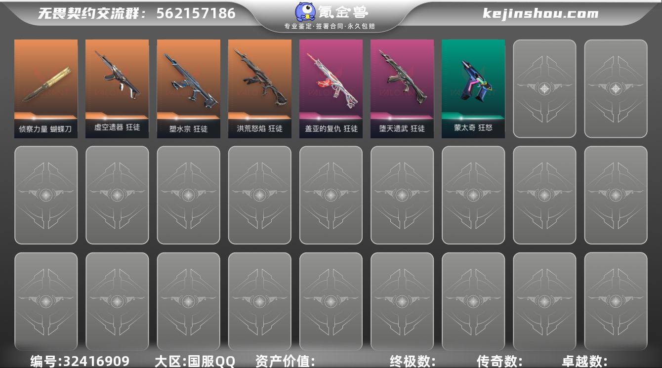 Q193864 【极品5AK皮+1精品刀皮+565R点毕业小号】无畏契约/等级195/段位黄金/英雄28/皮肤14/资产10920/已使用R点415/剩余R点565/侦察力量-蝴蝶刀,虚空遗器-狂徒,洪荒怒焰-狂徒,塑水宗-狂徒,堕天遗武-狂徒,盖亚的复仇-狂徒