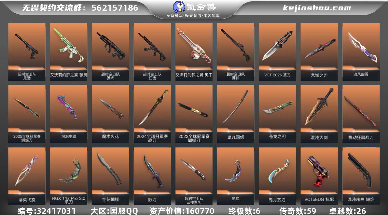 【自带包赔 可赔三倍】:库存价值160770 限定22 24 25 怜悯 苍龙之刃 187款皮肤 多热门主战刀皮 性价比超值大库存号 【限定】: VCT 2026 篆刀, 无畏契约季前邀请赛 悲悯之刃, 2025全球冠军赛 狂徒, 2025全球冠军赛 蝴蝶刀, 2022全球冠军赛 幻影, 2022全球冠军赛 蝴蝶刀, 5周年//公测重制版 苍龙之刃, 2024全球冠军赛 幻影, 2024全球冠军赛 战刀 【近战】: VCT 2026 篆刀, 影刃, 无畏契约季前邀请赛 悲悯之刃, 流风回雪, 2025全球冠军赛 蝴蝶刀, 泡泡电锯, 魄月玄刃, 魔术火花, 机动狂飙 战刀, 影钩, 超时空卫队 三棱军刺, 落英飞旋, 2022全球冠军赛 蝴蝶刀, 5周年//公测重制版 苍龙之刃, 穿花蝴蝶, 鬼丸国纲, 2024全球冠军赛 战刀, 混沌大剑, RGX 11z Pro//3.0 爪刀 【狂徒】: 耀鳞威龙 狂徒, 奇点//2.0 狂徒, 光荣异象 狂徒, 创·纪元 狂徒, 2025全球冠军赛 狂徒, 奇幻朋克//3.0 狂徒, 机动狂飙 狂徒, 洪荒怒焰 狂徒, 紫阙金琅 狂徒, 超时空卫队 狂徒, 盖亚的复仇 狂徒, 塑水宗 狂徒, 堕天遗武 狂徒, 混沌序曲 狂徒 【幻影】: 黯夜怪谈 幻影, 洪荒怒焰 幻影, 混沌序曲//2.0 幻影, 末日泡泡 幻影, 般若假面 幻影, 奇幻朋克//3.0 幻影, 2022全球冠军赛 幻影, 侦察力量 幻影,...
