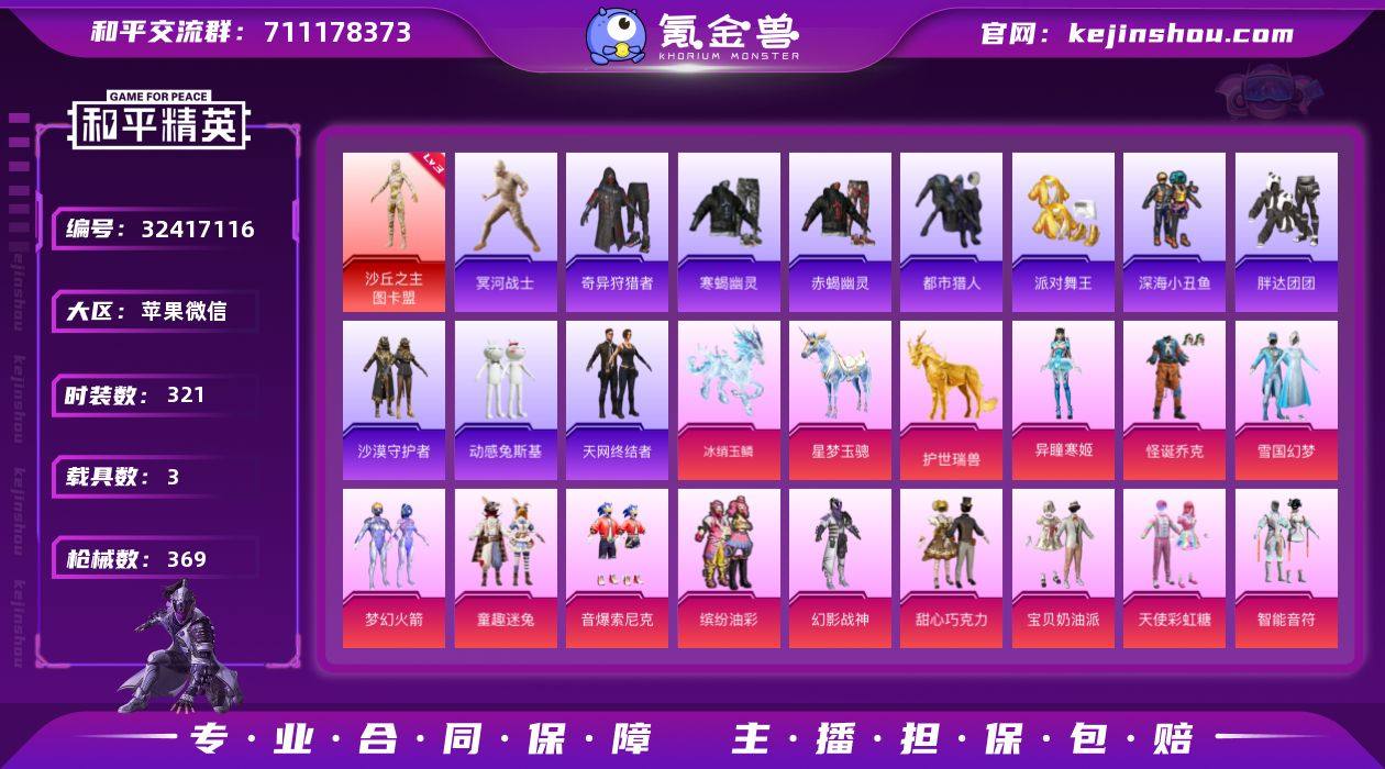 可实名苹果V一切正常-图卡盟大精品身法素材号-1红36粉19特效枪13载具 浪客战士木乃伊都市天网怪诞黑丝追光队服星星裤318个套装364个枪皮肤 时装数: 1260 载具数: 13 枪械数: 371 战备数: 248 神级装扮: 沙丘之主-图卡盟 热门装扮: 奇异狩猎者,梦幻火箭(新101),星际漫游者,极限特训,呆萌铁蟹,怪诞乔克,深渊皇后,金风玉露,天使彩虹糖,梦魇先生,放客神游,万圣娃娃,迅捷狂鲨,鹰眼刺客,智能音符,缤纷油彩,爱崽白熊,都市猎人,狮王雄心,绚金战神,花间之火,新星烈龙,潮汐统领,雪国幻梦,星之彼岸,相思残雪,飓风飞鹰,冥河战士,暗夜玫瑰,沙场疾风,洛天依,初号机款机体服,精灵娃娃,甜心娃娃,复仇流浪者,荒漠赏金,沙漠守护者,潮萌小黄鸭,浪客战士,胖达团团,神秘黑猫,动感兔斯基,纯珍童话,赤蝎幽灵,暗夜魅影,宙之时溯,星云暗核,莲影清波,傲傲奶龙,紫钛骑兵,冰炎战车,熔岩统帅,圣堂之誓,小叽联名款 载具: 特斯拉Model 3(冷光银),合金龙骨(蓝),合金龙骨(绿),焰龙咆哮,兰博基尼Estoque(炫光金),兰博基尼Aventador SVJ(翡翠绿),路特斯ELETRE(冰川蓝),路特斯ELETRE(花绽灰),宾利BATUR(极速紫),宾利添越(浅瞪羚棕),宾利欧陆GT敞篷(火焰橘),赤兔,照夜玉狮子,僚机-萌酷奶龙 稀有枪皮: MG3洛神天依,M762甜蜜誓约,AKM炫紫旋律,Kar98K伏魔团,M416五爪金龙,DP-28扶摇飞仙,M416心之恋语,UMP45相思残雪,SCAR-L机甲封神,SLR暗夜玫瑰,SCAR-L青春物语,汤姆逊荒漠赏金,AKM星际浪客,SCAR-L彩装战姬,MG3酷泡奶龙,AKM绿萝繁花,DP-28圣堂之誓,P90沙丘之主,AWM天使羽翼,Kar98K-巳巳如意,破片手榴弹-热量炸弹