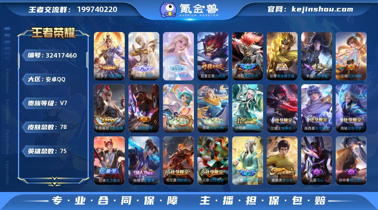 【秒换绑】安卓Q-V7-【金标蚩奼】最强王者段位-75英雄-78皮肤-1典藏皮肤-2无双-7传说-29史诗 【英雄全皮】:孙权全皮 【荣耀典藏】:花木兰九霄神辉 【无双皮肤】:孙悟空无相,甄姬雪境奇遇 【传说皮肤】:云缨幻光神枪,马超琥珀纪元,铠绛天战甲,李信一念神魔,干将莫邪久胜战神,达摩黄金狮子座,百里玄策白虎志 【限定皮肤】:狄仁杰阴阳师,赵云皇家上将,元歌云间偶戏,元歌无心,狄仁杰魔术师,项羽海滩派对,孙悟空至尊宝,百里玄策白虎志,裴擒虎李小龙,司空震地狱燃心,马超琥珀纪元,镜青焰无极 【年限皮肤】:百里玄策白虎志 【赛季限定】:甄姬逆浪荇歌,亚瑟荣光之誓 【战令限定】:元歌云间偶戏,司空震地狱燃心,镜青焰无极,周瑜百相守梦,孙策百相守梦,兰陵王傩神司,莱西奥光弋星穹,明世隐往忆晖光,周瑜线条小狗,小乔线条小狗 【史诗皮肤】:周瑜线条小狗,小乔线条小狗,少司缘巫礼祀神,兰陵王傩神司,莱西奥光弋星穹,周瑜百相守梦,狂铁龙之律动,赵怀真器灵浮梦炉,弈星万物之道,镜青焰无极,司空震地狱燃心,元歌无心,司马懿暗渊魔法,杨戬天秀启明,元歌云间偶戏,裴擒虎李小龙,孙尚香时之恋人,狄仁杰鹰眼统帅,阿轲节奏热浪,白起星夜...