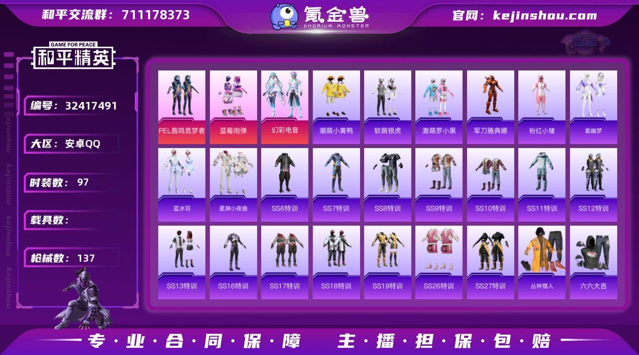 可二次【特价出售/店主推荐】安卓 手Q-3粉装-1粉色飞行器-40311热力值-7王牌印记-97套装-137枪皮【热门品类】:角色-军刀雅典娜,套装-潮萌小黄鸭,套装-粉红小猪【粉色套装】:粉装-PEL轰鸣竞梦者,粉装-蓝莓炮弹,粉装-幻彩电音【粉色飞行器】:月下星之子飞行器