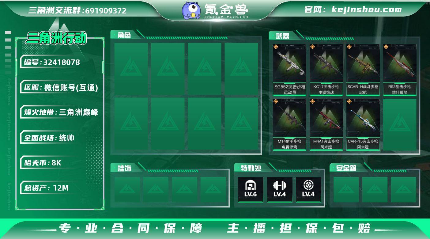 【933187】[17442824]总资产:12.8M 3干员外观 1近战传说 22传说枪械 哈夫币:8.039K 可二次 可修改实名 【烽火地带段位】三角洲巅峰 【全面战场段位】上等兵 【干员外观】骇爪-维什戴尔,红狼-电锯惊魂,露娜-金牌射手(S7) 【传说武器皮肤】近战武器-暗星,KC17突击步枪-电锯惊魂,M14射手步枪-电锯惊魂,R93狙击步枪-维什戴尔,SCAR-H战斗步枪-启航,SG552突击步枪-运动员,勇士冲锋枪-万金泪冠,腾龙突击步枪-万金泪冠,AWM狙击步枪-万金泪冠,.357左轮-缄花,SR-25射手步枪-缄花,M14射手步枪-缄花,SMG-45冲锋枪-锦绣,K437突击步枪-锦绣,AKM突击步枪-锦绣,MK47突击步枪-暗星,SR-3M紧凑突击步枪-暗星,M14射手步枪-蛮荒,腾龙突击步枪-马年祥瑞,G18-马年祥瑞,M4A1突击步枪-阿米娅,CAR-15突击步枪-阿米娅 【史诗武器皮肤】勇士冲锋枪-檀劫铳影