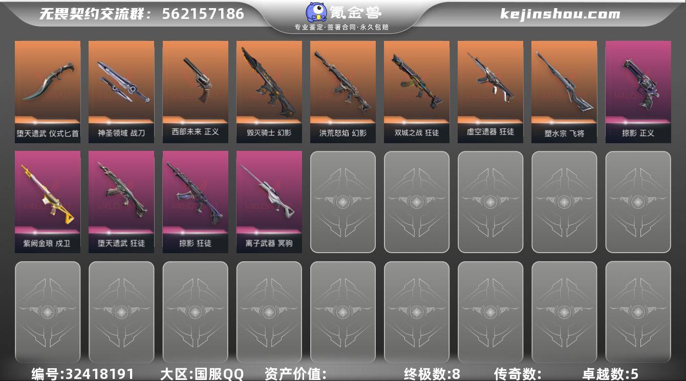 【英雄】:幻棱,炼狱,维斯,暮蝶,钛狐,壹决,铁臂,捷风,雷兹,幽影,不死鸟,贤者,猎枭,蝰蛇,零,芮娜,奇乐,尚勃勒,霓虹,斯凯,夜露,星礈,K/O,海神,盖可,黑梦,钢锁 【近战武器】:近战武器-堕天遗武 仪式匕首,近战武器-神圣领域 战刀 【狂徒】:狂徒-双城之战,狂徒-虚空遗器,狂徒-堕天遗武,狂徒-掠影 【幻影】:幻影-洪荒怒焰,幻影-毁灭骑士,幻影-神圣领域 【戍卫】:戍卫-紫阙金琅,戍卫-月球哨兵 【獠犬】:獠犬-神圣领域 【冥驹】:冥驹-离子武器,冥驹-星云暗涌 【飞将】:飞将-塑水宗 【莽侠】:莽侠-月球哨兵 【战神】:战神-神圣领域 【雄鹿】:雄鹿-月球哨兵 【骇灵】:骇灵-星云暗涌 【蜂刺】:蜂刺-星云暗涌 【正义】:正义-西部未来,正义-掠影,正义-纳米打击,正义-月球哨兵 【鬼魅】:鬼魅-诡秘蛇影,鬼魅-星云暗涌 【狂怒】:狂怒-神圣领域 【卡面】:终章:激斗汉堡 卡面,进入射程 卡面,《双城之战》拥抱 卡面,精灵大战 卡面,欢迎来到底城 卡面,南瓜盛典 卡面,正义的化身 卡面,最高舞台 卡面,梦幻奶茶 卡面,零点嗅探设计图 卡面,无畏契约GO!第一卷:芮娜 卡面,无畏契约GO!第一卷:零 卡面,代号红色 卡面,新兵报到 卡...