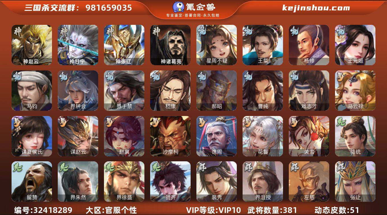 【1277】官阶:大将军;VIP等级:VIP10;史诗武将数量:41;动态皮肤数量:51;武将总数:381;史诗宝珠数量:36;将魂数量:4661;神将:6;魏国史诗武将:24;蜀国史诗武将:8;吴国史诗武将:5;群史诗武将:15