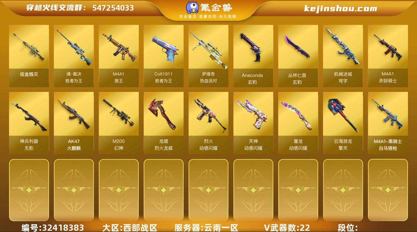 西部战区(云南一区)22v【M200-幻神,动感闪耀套装,AK47-火麒麟,无影-神兵利器】1炫金【炫金毁灭】4角色【乔伊教练,修道士,雪域霜狐,云海玲珑】截图展示段位不代表实际段位 如赛季更新等不可抗拒因素发生变化、时限道具不保证所剩时间