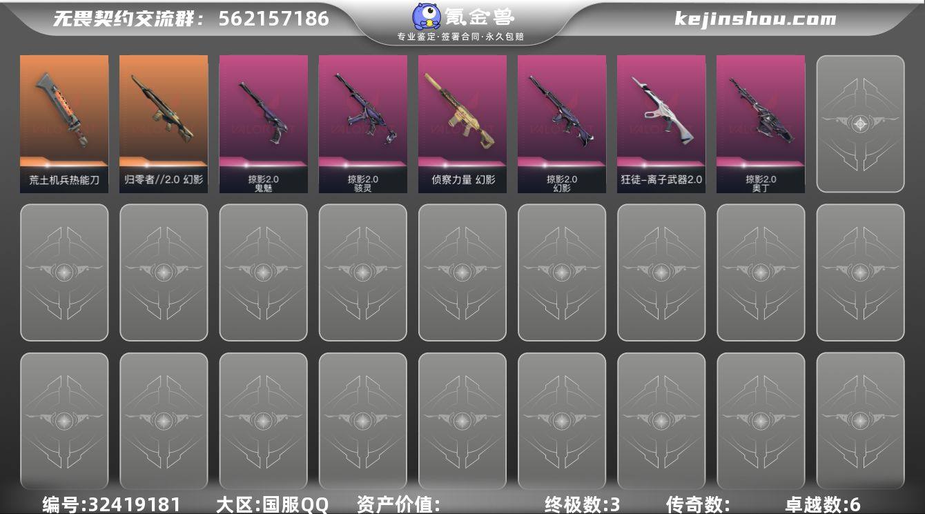 【编号05908可秒换绑 店长推荐捡漏号!】【套装】:归零者套装 【英雄】:炼狱,暮蝶,壹决,铁臂,捷风,雷兹,幽影,不死鸟,贤者,猎枭,蝰蛇,零,芮娜,奇乐,尚勃勒,霓虹,斯凯,夜露,星礈,K/O,海神,盖可,黑梦,钢锁 【近战 武器】:近战武器-剥皮小刀,近战武器-珍珠棘贝 短剑,近战武器-流星兵团 短剑,近战武器-超能偶像 应援棒,近战武器-钢轨卫士 战锤,近战武器-弧光异彩 军刀,近战武器-沙尘幻旅 匕首,近战武器-生物收割器 【狂徒】:狂徒-归零者,狂徒-盖亚的复仇,狂徒-紫阙金琅,狂徒-超能偶像,狂徒-钢轨卫士,狂徒-弧光异彩,狂徒-流星兵团,狂徒-沙尘幻旅 【幻影】:幻影-天界神兵//2.0,幻影-噬源兽防卫工程,幻影-珍珠棘贝,幻影-聚合之力,幻影-神罚,幻影-战术小伙伴 【戍卫】:戍卫-超能偶像,戍卫-钢轨卫士,戍卫-珍珠棘贝,戍卫-彩梦之城,戍卫-萌彩剪影,戍卫-战术熊与伙伴们 【獠犬】:獠犬-归零者,獠犬-弧光异彩,獠犬-采蜜小蜂队,獠犬-复古浪潮,獠犬-胡桃狂想,獠犬-战术小伙伴 【冥驹】:冥驹-归零者,冥驹-复古浪潮,冥驹-胡桃狂想 【飞将】:飞将-沙尘幻旅,飞将-聚合之力,飞将-信手涂鸦,飞将-光导纤维,飞将-战术熊与伙伴们 【...