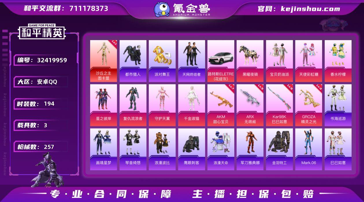 【936524】安卓【极品男神号 天马神君-驭风(一级),沙丘之主-图卡盟(一级),套装-都市猎人,套装-派对舞王,套装-天网终结者,套装-金羽特工,角色-Mark.06,AKM-暮色玫影(三级),ARX-无垠阁(五级),路特斯ELETRE(花绽灰),黑曜夜骑】 手Q-2神装-8粉装-11特效枪-3载具-7粉色飞行器-84955热力值-18王牌印记-194套装-257枪皮 【红色神装等级】:天马神君-驭风(一级),沙丘之主-图卡盟(一级) 【红色角色神装】:天马神君-驭风,沙丘之主-图卡盟 【热门品类】:套装-浪漫天命,套装-都市猎人,套装-派对舞王,角色-军刀雅典娜,套装-天网终结者,套装-金羽特工,套装-浪漫波比,角色-Mark.06 【粉色套装】:粉装-宝贝奶油派,粉装-天使彩虹糖,粉装-香水柠檬,粉装-星之彼岸,角色-复仇流浪者,角色-守护天翼,角色-千金淑猫,角色-虎痴许褚 【粉色枪皮等级】:AKM-甜心宝贝(七级),AKM-暮色玫影(三级),GROZA-精灵之光(三级),ACE32-萌骑漫游(二级),ARX-无垠阁(五级),UMP45-萌骑冒险(二级),AKS-74U-森灵之息(五级),Kar98K-巳巳如意(五级),Mk14-福马献瑞(五级),PKM-萌骑夺宝(二级),燃烧瓶-薄荷可可(七级) 【粉色载具】:路特斯ELETRE(花绽灰),黑曜夜骑,九霄玄鹿 【粉...