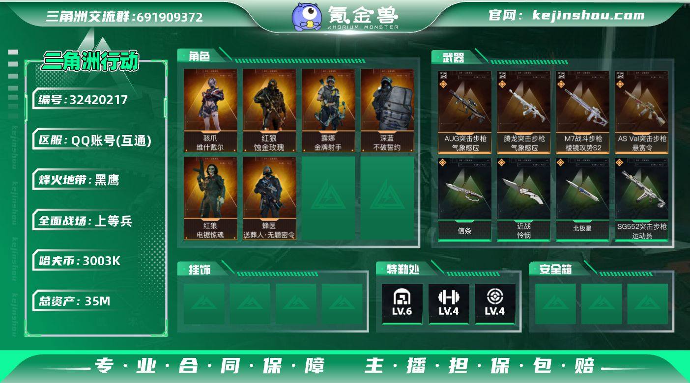 【935419】35m总资产-3003k哈伏币-60烽火等级-黑鹰-30战场等级-上等兵 【干员外观】:红狼-蚀金玫瑰,骇爪-维什戴尔,蜂医-送葬人·无题密令,深蓝-不破誓约,红狼-电锯惊魂,露娜-金牌射手 【近战皮肤】:近战-怜悯,近战-北极星,近战-信条,近战-黑鹰 【典藏外观】:AUG突击步枪-气象感应,腾龙突击步枪-气象感应,M7战斗步枪-棱镜攻势S2,AS Val突击步枪-悬赏令 【传说外观】:M4A1突击步枪-蚀金玫瑰,M4A1突击步枪-阿米娅,ASh-12战斗步枪-鹅鸭杀,SG552突击步枪-运动员,AK-12突击步枪-纵横,SCAR-H战斗步枪-水墨云图,SCAR-H战斗步枪-启航,AS Val突击步枪-死神玫瑰,腾龙突击步枪-捞点薯条,腾龙突击步枪-死神玫瑰,K437突击步枪-北极星,KC17突击步枪-电锯惊魂,P90冲锋枪-信条,Vector冲锋枪-能天使-午夜邮差,勇士冲锋枪-能天使-午夜邮差,QCQ171冲锋枪-北极星,QCQ171冲锋枪-鹅鸭杀,S12K霰弹枪-死神玫瑰,725双管霰弹枪-送葬人-无题密令,M250通用机枪-骑士之心,M250通用机枪-纵横,QJB201轻机枪-鹅鸭杀,M14射手步枪-电锯惊魂,SR-25射手步枪-信条,杠杆式步枪-纵横,R93狙击步枪-维什戴尔,AWM狙击步枪-捞点薯条,93R-捞点薯条 【史诗外观】:KC17突击步枪-碎...