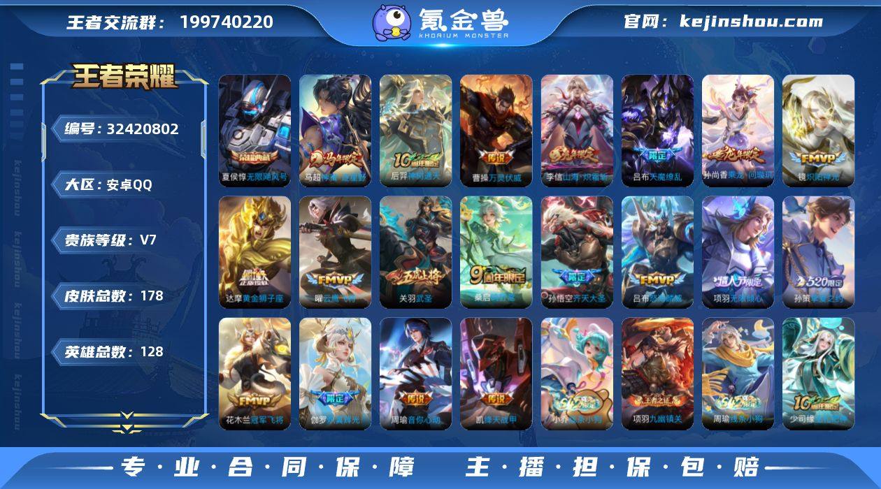 实名: 可修改 性别: 男号 贵族等级: V7 英雄数: 128 皮肤数: 178 荣耀水晶: 无限飓风号 传说皮: 黄金狮子座,冠军飞将,云鹰飞将,绛天战甲,炽阳神光,音你心动-周瑜,挚爱之约,山海·炽霜斩,炽翼辉光,乘龙·问璇玑,万灵伏威,神树通天,神骥·逐星野 限定皮: 武圣,天魔缭乱,五谷丰年,怒海麟威,山海·玄木吟,齐天大圣,无限倾心-项羽,鸣野蒿 亮点: 【优质装备】:无限飓风号(高达),黄金狮子座,冠军飞将,云鹰飞将(小将军),绛天战甲(鸡嘴战神),炽阳神光,音你心动-周瑜,挚爱之约,山海·炽霜斩(李信年限),炽翼辉光(娃娃菜牛角包),万灵伏威