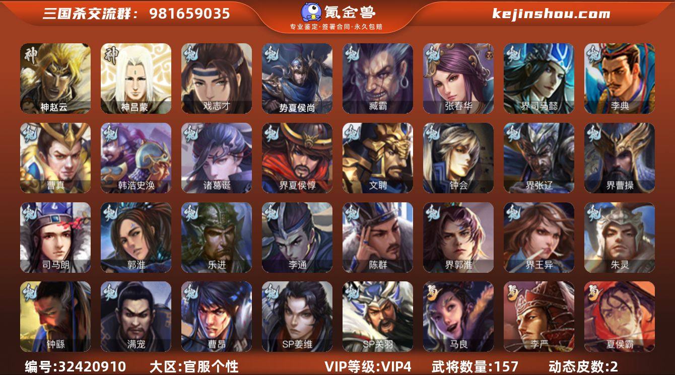 【14789614】官阶:先锋将军;VIP等级:VIP4;史诗武将数量:4;动态皮肤数量:2;武将总数:157;史诗宝珠数量:0;将魂数量:4376;神将:1;魏国史诗武将:0;蜀国史诗武将:0;吴国史诗武将:1;群史诗武将:1