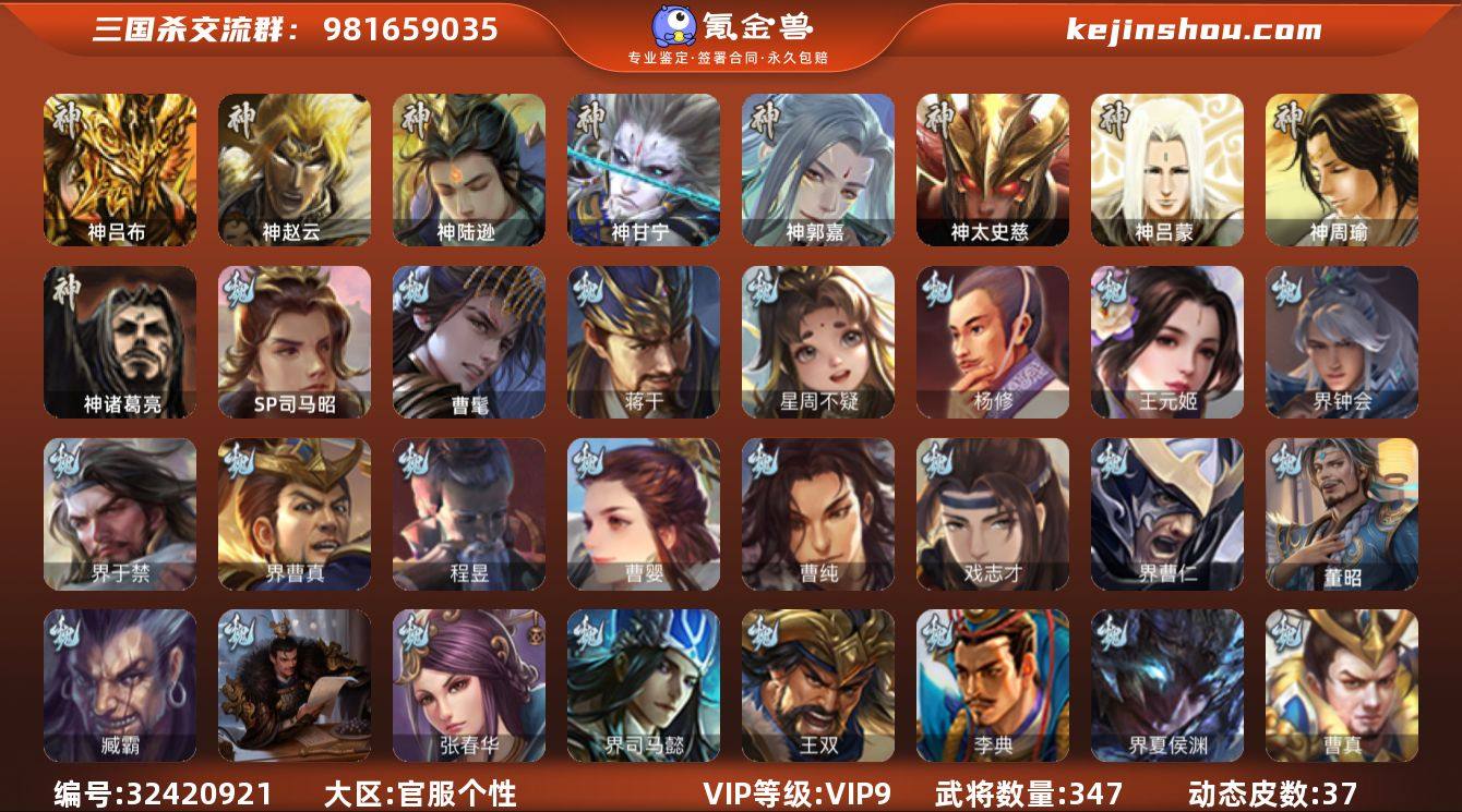 【14789611】官阶:大将军;VIP等级:VIP9;史诗武将数量:45;动态皮肤数量:37;武将总数:347;史诗宝珠数量:0;将魂数量:103;神将:7;魏国史诗武将:20;蜀国史诗武将:7;吴国史诗武将:6;群史诗武将:13