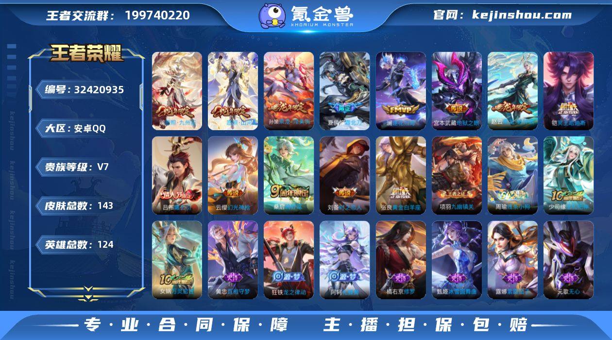 【WZ181368】143皮肤-1无双-15传说-36史诗【无双皮肤】:李信问心剑【传说皮肤】:关羽神骥镇沧海,花木兰异界灵契,司空震愿照山河定,澜愿照九州拓,云缨幻光神枪,桑启鸣野蒿,夏侯惇霜北刀,铠冥王哈迪斯,吕布曦玄引,孙策乘龙淬吴钩,赵云乘龙铭钟鼎,澜逐花归海,刘备时之恋人,张良黄金白羊座,宫本武藏地狱之眼【限定皮肤】:夏侯惇霜北刀,铠冥王哈迪斯,大乔绒语心约,姜子牙天穹之誓,狄仁杰阴阳师,赵云皇家上将,高渐离玩趣恶龙,元歌无心,狄仁杰魔术师,项羽海滩派对,百里玄策原初追逐者,云中君纤云弄巧,鲁班大师探海日志,张良古海寻踪,鬼谷子天穹祈灯,孙策乘龙淬吴钩,赵云乘龙铭钟鼎,吕布曦玄引,沈梦溪龙舞盛年,鲁班七号蔬乡物语,李元芳蔬乡物语,刘邦剑破天穹,程咬金群星魔术团,刘备异域游侠,周瑜熔金海岸【年限皮肤】:孙策乘龙淬吴钩,赵云乘龙铭钟鼎,司空震愿照山河定,澜愿照九州拓【赛季限定】:鲁班大师探海日志,张良古海寻踪,鬼谷子天穹祈灯,刘邦剑破天穹,姜子牙天穹之誓,东皇太一噬灭天穹,太乙真人谧流熔炉,钟馗虚灵犬护,甄姬逆浪荇歌,亚瑟荣光之誓,百里玄策原初追逐者,牛魔星界战将,项羽九幽镇关【战令限定】:鲁班七...