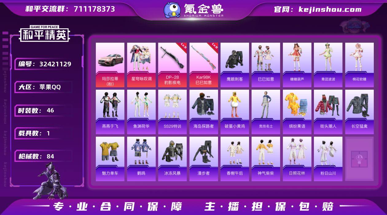 苹果 手Q-1粉装-3特效枪-1载具-0粉色飞行器-21256热力值-6王牌印记-46套装-84枪皮 【粉色套装】:粉装-星穹咏叹调 【粉色枪皮等级】:Kar98K-巳巳如意(五级),Mk14-福马献瑞(四级),DP-28-豹影疾电(五级) 【粉色载具】:玛莎拉蒂Ghibli(粉) 【粉色枪皮】:Kar98K-巳巳如意,Mk14-福马献瑞,DP-28-豹影疾电