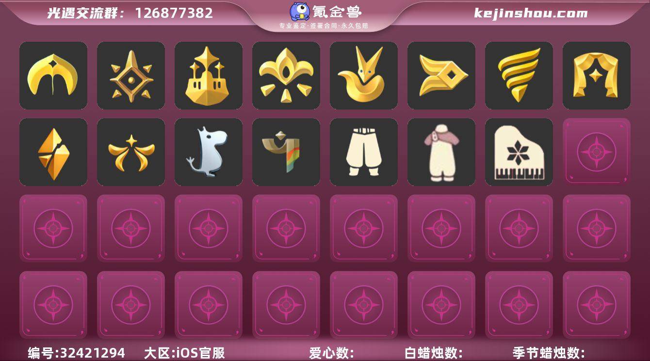 8季11翼白枭绊爱透明蝶翼武士裤王子围巾TGC斗篷虚荣星月头冠 资源:蜡烛929 爱心7 红烛30 已毕业地图:全地图毕业 毕业季节:潜海季 表演季 破晓季 欧若拉 追忆季 归巢季 九色鹿 毕业物品:单边小辫 暗红斗篷 氧气面具 黄眉企鹅面具 燕尾斗篷 白枭发型 双翼遥鲲斗篷 冥龙斗篷 留辫蘑菇头 高领舞服 透明蝶翼斗 肩带 追忆之书 五塑彩羽发 五塑彩带斗 九色鹿丸子头 九色鹿丝带裤 九色鹿飞天斗篷 稀有礼包:王子围巾 新春福娃礼包 TGC斗篷 绊爱套装 大桔大利 鲤跃龙门 雪花发夹 玉兔头饰 星月头冠 秋千 花憩茶桌 小憩茶桌 热门裤子: 背带裤 遥鲲长袍 绑带舞服 白棉裤 武士裤 搓澡巾 紧身连体衣 小丑服 奔月长袍 女仆围裙 热门面具: 黄眉面具 一字眉 红兔面具 黑脸 矮人面具 潜海面具 黄鼠狼面具 红脸蛋 玫瑰花面具 热门发型: 海藻头 爆炸头 平菇 圆环发辫 龙头 发辫 大胡子 小飞象 雨妈 明制帽 箬笠 指甲盖 粗辫 龙骨 书虫 春丽丸子头 留辫蘑菇头 卡卡 蝴蝶结 公主头 虚荣 白枭 彩色脏辫 彩羽发型 兔子头 女巫发型 猫猫头 绊爱发型 光头 总裁头 郡主头 斗笠 正太头 水母头 热门头饰:珊瑚发饰 雪花发饰 橘子发饰 花环 红耳机 晃悠悠 辫子发饰 热门斗篷: tgc黑底斗篷 布条斗篷 花瓣斗篷 彩虹斗篷 绊爱斗篷 漩涡斗篷 海洋斗篷 郁金香斗篷 樱花斗篷 小王子围巾斗篷 透明蝶翼 蝴蝶斗篷 展翼圆环斗蓬 红金斗篷 新春福娃斗篷 鳐鲲长斗 地球日斗篷 冥龙长斗 暗花斗篷 五角星斗篷 黑金斗篷 白金斗篷 燕尾服斗篷 布丁斗篷 彩霞斗篷 国风斗篷 镂空斗篷 热门背饰: 号角 椅子 风铃 鲲灯 吊床 女巫茶桌 冥龙号角 圣诞节椅子 秋千 相机" 【毕业地图】:晨岛,云野,雨林,霞谷,暮土,禁阁 ,归巢季,潜海季,表演季,破晓季,欧若拉季,追忆...
