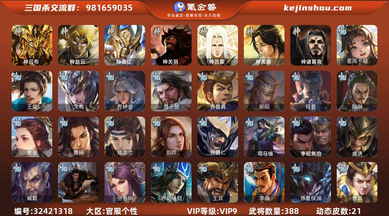 【14789609】官阶:大将军;VIP等级:VIP9;史诗武将数量:44;动态皮肤数量:21;武将总数:388;史诗宝珠数量:46;将魂数量:2417;神将:4;魏国史诗武将:10;蜀国史诗武将:9;吴国史诗武将:11;群史诗武将:10