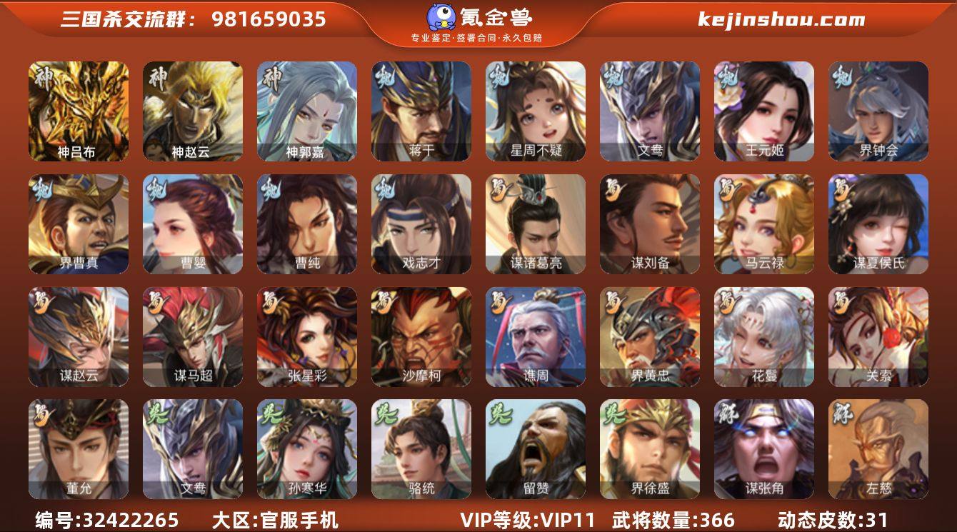 【1523】官阶:大将军;VIP等级:VIP11;史诗武将数量:44;动态皮肤数量:31;武将总数:366;史诗宝珠数量:0;将魂数量:2058;神将:6;魏国史诗武将:22;蜀国史诗武将:13;吴国史诗武将:4;群史诗武将:14