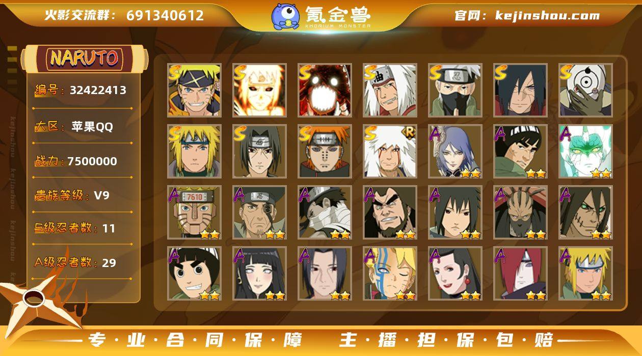 实名: 可修改 贵族等级: V9 S忍数: 11 A忍数: 29 战力值(万): 750 S级忍者: 佩恩「天道」,波风水门,宇智波鼬 「须佐能乎」,自来也 「舞之豪杰」,宇智波斑「白面具」,宇智波斑「秽土转生·解」,旗木卡卡西「须佐能乎」,自来也 「传说中的三忍」,漩涡鸣人 「暴怒·第六尾」,波风水门「九喇嘛连结」,漩涡鸣人·宇智波佐助