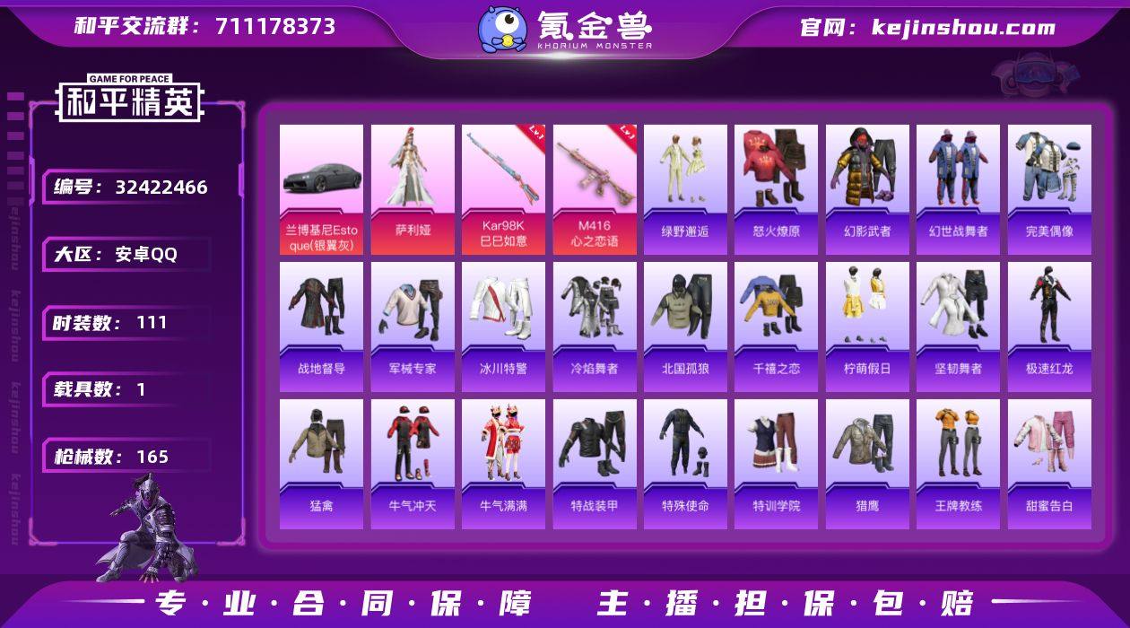 【kyhp159】安卓 手Q-4粉装-5特效枪-1载具-3粉色飞行器-40815热力值-6王牌印记-126套装-146枪皮 【热门品类】:套装-浪漫天命,套装-小丑鱼,套装-暗影哥特,角色-8号机,角色-Mark.06 【粉色套装】:角色-蔷薇星,角色-万古烈焰,角色-星云暗核,粉装-蜜语绒猫 【粉色枪皮等级】:AKM-绿萝繁花(五级),GROZA-镜光银凌(五级),AKS-74U-森灵之息(五级),Kar98K-巳巳如意(五级),DP-28-豹影疾电(五级) 【粉色载具】:宾利飞驰(布罗德盖棕双色) 【粉色枪皮】:AKM-绿萝繁花,GROZA-镜光银凌,AKS-74U-森灵之息,Kar98K-巳巳如意,DP-28-豹影疾电 【粉色飞行器】:齐天大圣飞行器,镜光幻境飞行翼,星空武士飞行器 【粉色降落伞】:垂柳戏鸭降落伞,第五大道降落伞 【稀有套装】:套装-巳巳如意,套装-糖糖葫芦,套装-青团波波,角色-俏兔智灵,套装-燕燕于飞,套装-鱼渊荷华,角色-蜜桃派对,套装-星渊小夜曲,套装-霓虹热舞,套装-书海巡游,套装-画境星梦,套装-琴音绮想,角色-碧青流霞 【稀有枪皮】:AKM-墨染幽兰,AKM-灼热熔岩,M16A4-幻世战舞者,SCAR-L-夜灯,SCAR-L-玉兔迎春,M416-摩登王国,M416-糯团青竹,M416-红色方程式,M416-蓝色火焰,GROZA-紫翼圣骑,AUG-天降萌叽,AUG-耀粉歌者,QBZ-飞驰魅影,M762-彩虹符号,M762-橘柚倾心,AC-VAL-天降萌叽,蜜獾-娇憨猪猪,ACE32-画境星梦,UZI-天降萌叽,UZI-娇憨猪猪,UZI-炫彩节奏,UZI-红色方程式,UZI-月影灵韵,UMP45-夜灯,UMP45-蓝色火焰,汤姆逊-耀粉歌者,MP5K-画境星梦,P90-飞驰魅影,P90-巳巳如意,Kar98K-彩虹符号,Kar98K-飞驰魅影,M24-炫彩节奏,M24-樱桃泡泡,SKS-未来歌姬,Mini14-旋转彩虹,Mini14-炫彩节奏,Mini14-穿刺龙虾,Mini14-筑梦精灵,Mini14-耀粉歌者,SLR-娇憨猪猪,SLR-圣穹绘梦,莫辛纳甘-蜜语绒猫,M417-惊鸿侠骨,MK2...