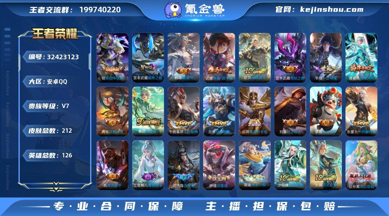 【编号94442可秒换绑】【店长推荐捡漏号!】店长推荐特价处理精品号安卓Q-V7-最强王者段位-122英雄-180皮肤-1典藏-0珍品无双-0无双-1珍品传说-19传说-43史诗 【荣耀典藏】:伽罗最初的交响 【珍品传说】:孙策时之奇旅 【内测皮肤】:狂铁特工战影 【传说皮肤】:武则天海洋之心,孙悟空地狱火,宫本武藏地狱之眼,貂蝉仲夏夜之梦,后羿黄金射手座,达摩黄金狮子座,张良黄金白羊座,貂蝉猫影幻舞,李信一念神魔,镜炽阳神光,铠绛天战甲,周瑜音你心动,王昭君乞巧织情,赵云淬星耀世,蔡文姬花朝如约,马超无双飞将,孙尚香音你闪耀,云缨幻光神枪,妲己愿照众生和 【限定皮肤】:大乔绒语心约,姜子牙天穹之誓,狄仁杰阴阳师,赵云皇家上将,庄周高山流水,扁鹊奇幻香踪,芈月幻夜卜梦,狄仁杰魔术师,达摩沙漠行僧,项羽海滩派对,关羽冰锋战神,兰陵王金庭之子,李元芳云中旅人,钟馗驱傩正仪,杨戬潮玩骑兵,黄忠火炮绅士,苏烈千军破阵,裴擒虎擒涛扼浪,猪八戒猪悟能,嫦娥拒霜思,嫦娥暖冬兔眠,鲁班大师探海日志,桑启海盐诗旅,暃星界游侠,阿古朵江河有灵,张良古海寻踪,妲己灵卜魔法,鬼谷子天穹祈灯,姬小满妄想食味,鲁班七号蔬乡物语,李元芳蔬乡物语,刘邦剑破天穹,程咬金群星魔术团,刘备异域游侠,芈月浮光幕影 【赛季限定】:达摩沙漠行僧,兰陵王金庭之子,张良古海寻踪,李元芳云中旅人,钟馗驱傩正仪,苏烈千军破阵,裴擒虎擒涛扼浪,鲁班大师探海日志,桑启海盐诗旅,鬼谷子天穹祈灯,刘邦剑破天穹,姜子牙天穹之誓 【战令限定】:扁鹊奇幻香踪,芈月幻夜卜梦,杨戬潮玩骑兵,黄忠火炮绅士,嫦娥暖冬兔眠,暃星界游侠,妲己灵卜魔法,鲁班七号蔬乡物语,李元芳蔬乡物语 【史诗皮肤】:项羽苍穹之光,露娜紫霞仙子,赵云皇家上将,赵云未来纪元,甄姬冰雪圆舞曲,狄仁杰魔术师,廉颇地狱...
