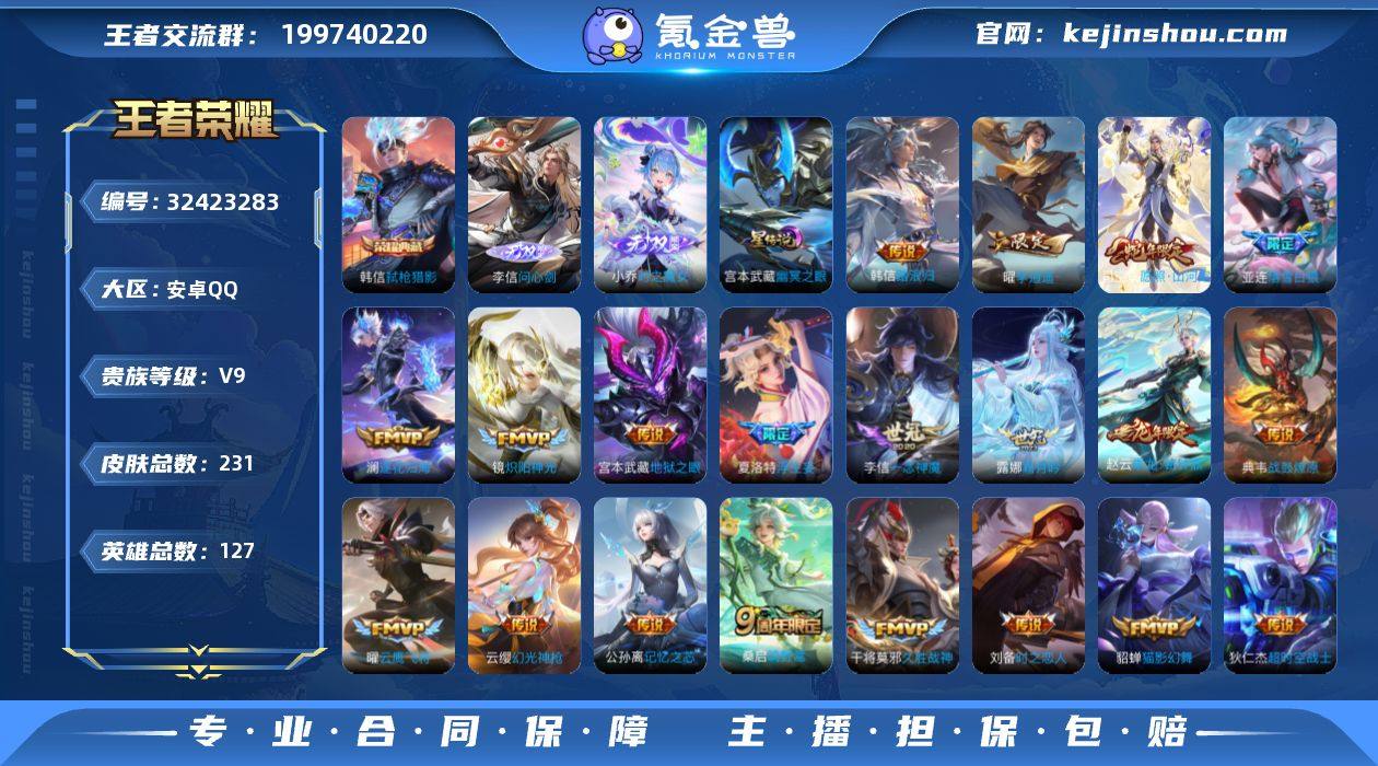 安卓Q-V7-最强王者段位-127英雄-241皮肤-1典藏皮肤-1无双-1珍品传说-20传说-70史诗【英雄全皮】:孙权全皮,敖隐全皮,空空儿全皮,影全皮【荣耀典藏】:韩信弑枪猎影【无双皮肤】:公孙离离恨烟【珍品传说】:马可波罗怪盗基德【传说皮肤】:韩信踏浪归,云缨神骥越千峰,后羿神树通天,澜愿照九州拓,云缨幻光神枪,桑启鸣野蒿,夏侯惇霜北刀,铠冥王哈迪斯,典韦战鼓燎原,铠琥珀纪元,澜逐花归海,狄仁杰夜礼服假面,吕布怒海麟威,王昭君乞巧织情,曜云鹰飞将,李信一念神魔,刘备时之恋人,达摩黄金狮子座,后羿黄金射手座,宫本武藏地狱之眼【限定皮肤】:公孙离离恨烟,夏侯惇霜北刀,铠冥王哈迪斯,蔡文姬夏日便利店,虞姬夏日便利店,姜子牙天穹之誓,狄仁杰阴阳师,赵云皇家上将,元歌无心,狄仁杰魔术师,项羽海滩派对,孙悟空至尊宝,李元芳银河之约,李元芳云中旅人,鬼谷子五谷丰年,百里玄策原初追逐者,裴擒虎李小龙,裴擒虎擒涛扼浪,鲁班大师探海日志,桑启海盐诗旅,艾琳流音漫舞,司空震地狱燃心,阿古朵江河有灵,张良古海寻踪,狄仁杰夜礼服假面,蒙恬荣光圣徽,鬼谷子天穹祈灯,铠琥珀纪元,沈梦溪龙舞盛年,鲁班七号蔬乡物语,李元芳蔬乡物语,刘邦剑破天穹,程咬金群星魔术团,周瑜熔金海岸【年限皮肤】:澜愿照九州拓【赛季限定】:李元芳云中旅人,桑启海盐诗旅,裴擒虎擒涛扼浪,鲁班大师探海日志,张良古海寻踪,鬼谷子天穹祈灯,刘邦剑破天穹,姜子牙天穹之誓,东皇太一噬灭天穹,太乙真人谧流熔炉,钟馗虚灵犬护,甄姬逆浪荇歌,亚瑟荣光之誓,百里玄策原初追逐者,蒙恬荣光圣徽,牛魔星界战将,项羽九幽镇关【战令限定】:李元芳银河之约,司空震地狱燃心,艾琳流音漫舞,鲁班七号蔬乡物语,李元芳蔬乡物语,蔡文姬夏日便利店,虞姬夏日便利店,亚连破空之剑,孙悟空神迹守卫,...