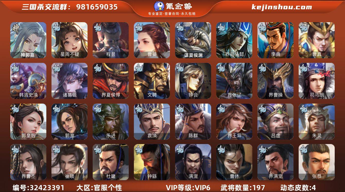 【4229】官阶:中军将军;VIP等级:VIP6;史诗武将数量:12;动态皮肤数量:4;武将总数:197;史诗宝珠数量:1;将魂数量:519;神将:1;魏国史诗武将:2;蜀国史诗武将:3;吴国史诗武将:2;群史诗武将:3