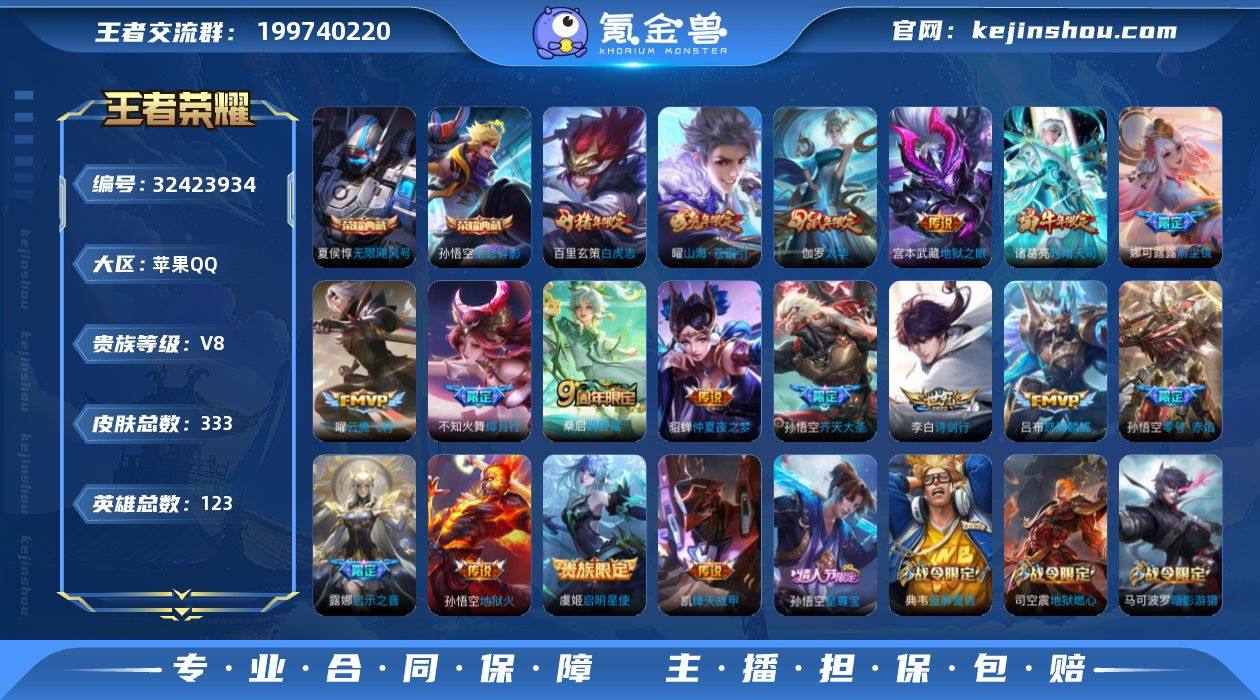 V8 1典藏 22传说 2星元 343皮肤 128英雄 【1水晶】夏侯惇-无限飓风号【22传说】李信-山海·炽霜斩,貂蝉-仲夏夜之梦,宫本武藏-地狱之眼,后羿-黄金射手座,铠-绛天战甲,李元芳-飞鸢探春,孙尚香-末日机甲,孙悟空-地狱火,虞姬-启明星使,吕布-怒海麟威,宫本武藏-惊梅引,伽罗-炽翼辉光,鲁班七号-时之奇旅,大乔-时之奇旅,澜-逐花归海,铠-琥珀纪元,曜-云鹰飞将,后羿-神树通天【2星元】孙尚香-未来机甲,貂蝉-金色仲夏夜之梦【93史诗】元歌-无心,鬼谷子-五谷丰年,妲己-时之奇旅,赵云-未来纪元,钟无艳-超时空战士,狂铁-电玩高手,明世隐-吟游魔法,阿轲-节奏热浪,阿轲-迷踪丽影,安琪拉-魔法小厨娘,安琪拉-心灵骇客,白起-星夜王子,百里守约-特工魅影,百里守约-朱雀志,百里玄策-原初追逐者,蔡文姬-舞动绿茵,曹操-幽灵船长,曹操-天狼征服者,蔡文姬-繁星吟游,嫦娥-如梦令,嫦娥-拒霜思,程咬金-功夫厨神,妲己-女仆咖啡,妲己-魅力维加斯,大乔-猫狗日记,狄仁杰-魔术师,狄仁杰-鹰眼统帅,典韦-蓝屏警告,貂蝉-圣诞恋歌,貂蝉-逐梦之音,伽罗-箭羽风息,干将莫邪-冰霜恋舞曲,干将莫邪-真爱魔法,公孙离-无限星赏官,宫本武藏-鬼剑武藏,关羽-冰锋战神,韩信-白龙吟,韩信-逐梦之影,韩信-飞衡,韩信-傲雪梅枪,花木兰-水晶猎龙者,花木兰-默契交锋,橘右京-修罗,黄忠-火炮绅士,镜-匿光追影者,铠-曙光守护者,兰陵王-暗隐猎兽者,兰陵王-驯魔猎人,老夫子-航海奇遇记,李白-千年之狐,李元芳-逐浪之夏,李元芳-银河之约,廉颇-地狱岩魂,刘邦-德古拉伯爵,刘禅-天才门将,露娜-紫霞仙子,鲁班七号-狮舞东方,吕布-圣诞狂欢,吕布-末日机甲,马超-神威,马可波罗-逐梦之星,蒙犽-狂想玩偶喵,米莱狄-胡桃异想国,墨子-金属风暴,芈月-白晶晶,裴擒虎-天狼狩猎者,上官婉儿-梁祝,裴擒虎-李小龙,孙策-猫狗日记,孙尚香-水果甜心,孙尚香-蔷薇恋人,孙尚香-时之恋人,王昭君-偶像歌手,夏侯...