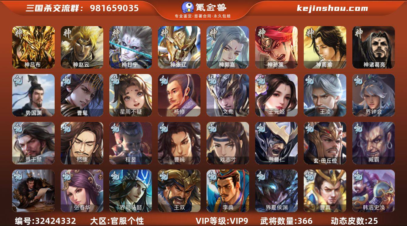 【4244】官阶:大将军;VIP等级:VIP9;史诗武将数量:44;动态皮肤数量:25;武将总数:366;史诗宝珠数量:0;将魂数量:1334;神将:7;魏国史诗武将:21;蜀国史诗武将:8;吴国史诗武将:7;群史诗武将:12
