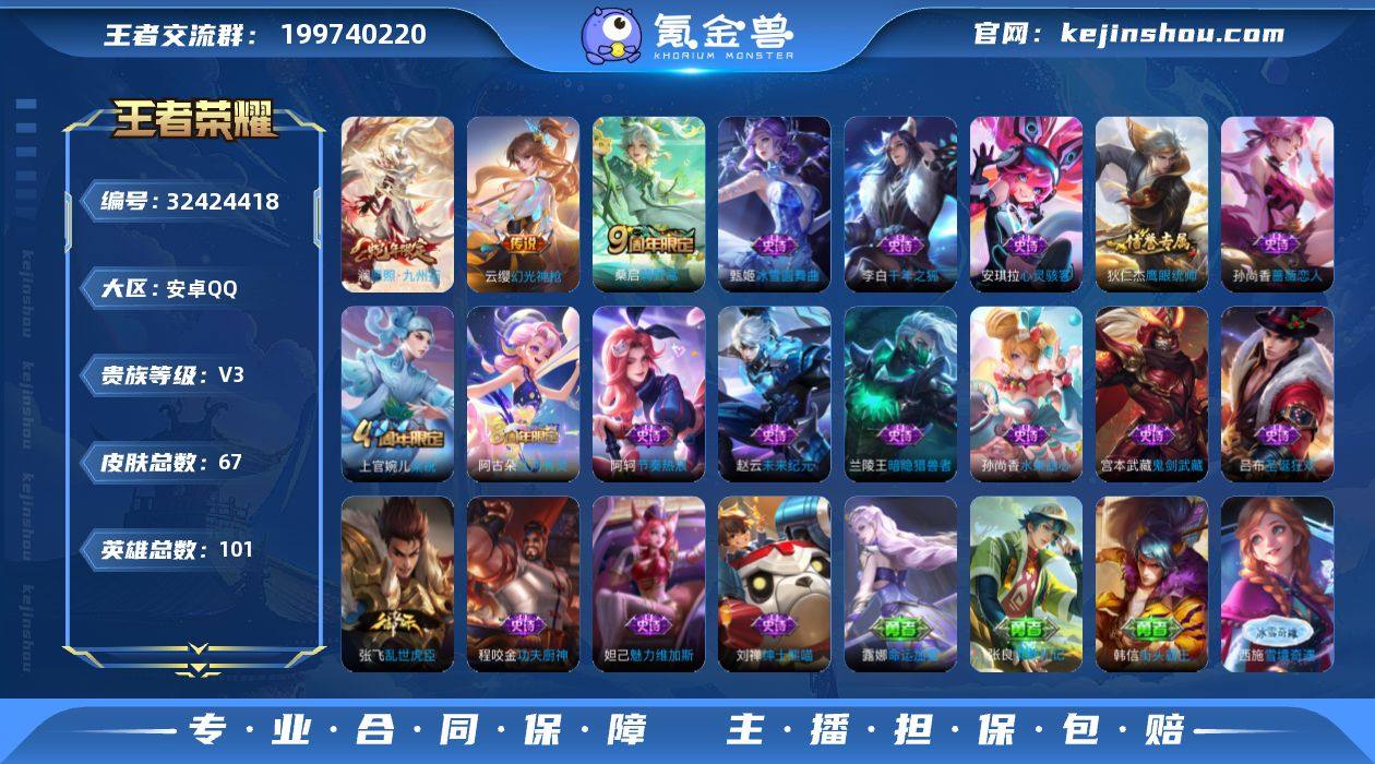 实名: 可修改 贵族等级: V3 英雄数: 101 皮肤数: 67 传说皮: 幻光神枪 限定皮: 梁祝,鸣野蒿,逐霄战戟,愿照·九州拓