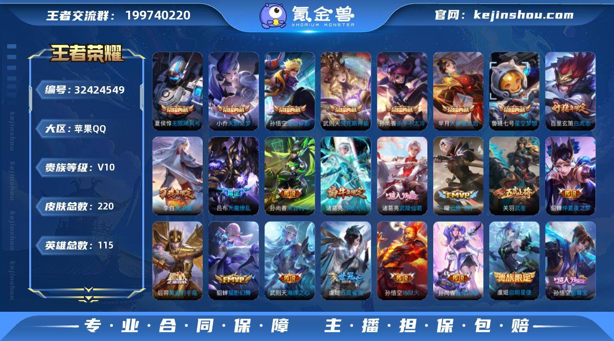 实名: 可修改 性别: 男号 贵族等级: V10 英雄数: 115 皮肤数: 220 荣耀水晶: 武则天,天鹅之梦,星空梦想,倪克斯神谕,无限飓风号,杀手不太冷,大秦宣太后,全息碎影 传说皮: 黄金射手座,云鹰飞将,猫影幻舞,云霓雀翎,末日机甲-孙尚香,地狱火,仲夏夜之梦,海洋之心,音你闪耀 限定皮: 李小龙,梁祝,时雨天司,引擎之心,武圣,魔法小厨娘,白晶晶,天魔缭乱,飞衡,天狼征服者,逐梦之音,逐梦之影,热情桑巴,凤求凰,白虎志,朱雀志,凤凰于飞,至尊宝,武陵仙君,默契交锋-花木兰,圣诞老人 亮点: 【优质装备】:武则天,天鹅之梦(小乔典藏),星空梦想(太空人),倪克斯神谕(宇宙婆娘),无限飓风号(高达),杀手不太冷,大秦宣太后,全息碎影(猴子典藏),黄金射手座,云鹰飞将(小将军),猫影幻舞,云霓雀翎,末日机甲-孙尚香(绿蚂蚱),地狱火,仲夏夜之梦(大飞蛾),海洋之心,音你闪耀(rap皮)