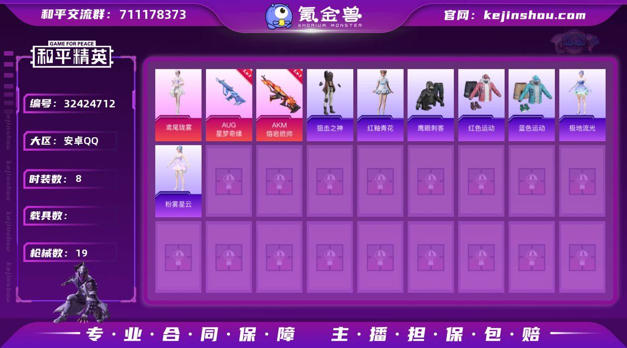 【AUG星梦奇缘AKM熔岩统帅3特效枪特价号 秒换绑不用等】 安卓Q区-4328热力值-8套装-19枪皮 【3特效枪】 AUG-星梦奇缘(2级) AKM-熔岩统帅(2级) UMP45-萌骑冒险(2级)【19热门】 鹰眼刺客 蓝色运动 红色运动 AA12-G-雨过天青 沙漠之鹰-雨过天青 P90-紫矿核心 M16A4-雨过天青 GROZA-福马献瑞 莫辛纳甘-鸢尾珑雾 MG3-火熔核心 MK20-H-星梦奇缘 狙击之神 极地流光 粉雾星云 汤姆逊-星梦奇缘 AMR-雨过天青 PKM-雨过天青 红釉青花 汤姆逊-像素花束【2背包】 星梦奇缘背包(3级) 星之彼岸背包(3级)