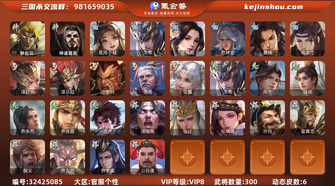 神赵云,神诸葛亮,星周不疑,文鸯,王元姬,魏-司马昭,界钟会,曹纯,戏志才,谋赵云,谋马超,沙摩柯,谯周,花鬘,周处,骆统,界朱然,界徐盛,贺齐,谋黄月英,张让,张琪瑛,星黄忠,麹义,界左慈,界李儒,公孙康,谋张角,张绣,许攸,神曹操-天下归心,神赵云-神龙天降,张昌蒲-龙年端午(动态),钟会-龙年端午(动态),曹丕-气荡山河(动态),星周不疑-龙年清明(动态),甄姬-明珠耀躯(动态),SP蔡文姬-兔年冬日(动态),钟会-谋谟之勋(动态),界钟会-谋谟之勋(动态),曹纯-长坂败备(动态),司马昭-昭威淮南(动态),星徐晃-斧引霹雳(动态),刘备-龙御天下(动态),诸葛果-仙池起舞(动态),孙茹-龙年七夕(动态),周处-义除三害(动态),吕蒙-剑起惊澜(动态),陆逊-龙年七夕(动态),孙权-永开吴祚(动态),黄盖-鏖战赤壁(动态),界黄盖-鏖战赤壁(动态),徐盛-破军杀将(动态),文鸯-势若万钧(动态),灵雎-霜刃绚练(动态),袁绍-声震寰宇(动态),李儒-鸠杀少帝(动态),界李儒-鸠杀少帝(动态)