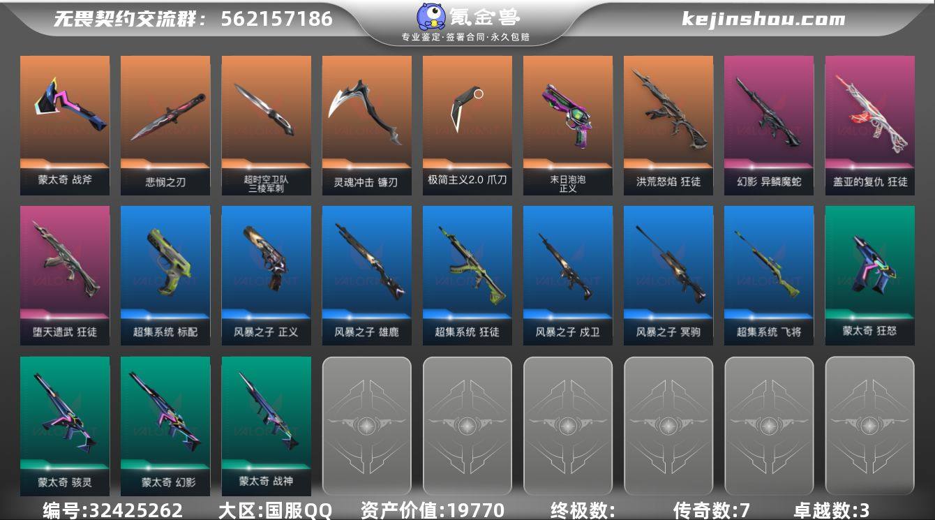 【猫猫AK刀皮很多性价比很高哦】 【套装】:VCT 2025 赛季套装 【英雄】:幻棱,炼狱,维斯,暮蝶,钛狐,壹决,铁臂,捷风,幽影,不死鸟,贤者,猎枭,蝰蛇,零,芮娜,奇乐,尚勃勒,霓虹,斯凯,夜露,星礈,K/O,盖可,黑梦,钢锁 【近战武器】:近战武器-穿花蝴蝶,近战武器-VCT 2025 爪刀,近战武器-金角扇,近战武器-诡秘蛇影 军刀,近战武器-神圣领域 战刀,近战武器-星际猎兵 短剑 【狂徒】:狂徒-艾沃莉的梦之翼,狂徒-机动狂飙,狂徒-日冕雄师,狂徒-诡秘蛇影 【幻影】:幻影-源能者娱乐系统,幻影-侦察力量,幻影-神圣领域,幻影-末日之翼 【戍卫】:戍卫-紫阙金琅,戍卫-月球哨兵,戍卫-折光棱晶 【獠犬】:獠犬-神圣领域 【冥驹】:冥驹-上古龙炎,冥驹-星云暗涌 【飞将】:飞将-黯夜怪谈,飞将-末日之翼 【莽侠】:莽侠-RGX 11z Pro//3.0,莽侠-诡秘蛇影,莽侠-月球哨兵 【战神】:战神-神圣领域 【奥丁】:奥丁-末日之翼 【判官】:判官-诡秘蛇影 【雄鹿】:雄鹿-源能者危机001,雄鹿-月球哨兵 【骇灵】:骇灵-无限竞技,骇灵-星云暗涌 【蜂刺】:蜂刺-星云暗涌,蜂刺-折光棱晶 【标配】:标配-折光棱晶 【VCT手枪】:标配-VCT25 x G2 【正义】:正义-西部未来,正义-月球哨兵 【鬼魅】:鬼魅-诡秘蛇影,鬼魅-星云暗涌 【狂怒】:狂怒-神圣领域 【短炮】:短炮-末日之翼 【卡面】:南瓜盛典 卡面,归乡 // 蝰蛇 卡面,树懒大作战 卡面,Clutch 卡面,无畏契约:尚勃勒 卡面,无畏契约GO!第一卷:芮娜 卡面,无畏契约GO!第一卷:零 卡面,无垠星环 卡面,《双城之战》金克丝 卡面,钢锁vs盖可 卡面,别冒尖 卡面,代号红色 卡面,新兵报到 卡面,V契约 卡面,无畏契约 卡面 【喷漆】:控场勿近 喷漆,致命优雅 喷漆,VCT x G2 喷漆,买装还是存钱 喷漆,红鳞 喷漆,无畏契约GO!第一卷:零 喷漆...