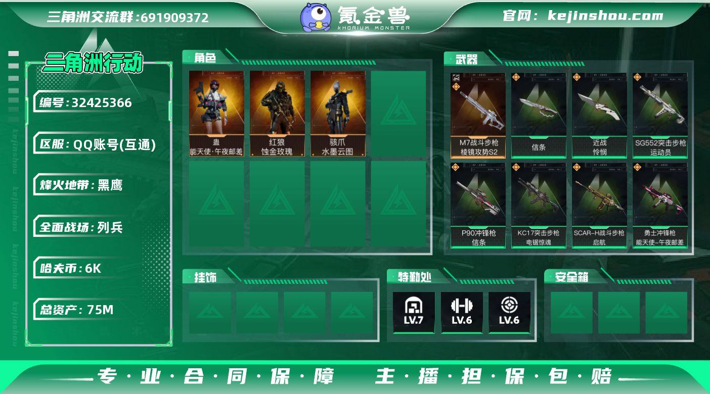 【937066】[17689959]总资产:75.7M 5干员外观 3近战传说 25传说枪械 哈夫币:6.535K 不可修改实名 高级安全箱4.15到期 【烽火地带段位】黑鹰 【全面战场段位】列兵 【干员外观】威龙-凌霄戍卫,红狼-蚀金玫瑰,骇爪-水墨云图,蛊-能天使·午夜邮差,露娜-金牌射手(S7) 【传说武器皮肤】近战武器-暗星,近战-信条,近战-怜悯,M7战斗步枪-棱镜攻势S2(典藏),SCAR-H战斗步枪-水墨云图,AWM狙击步枪-捞点薯条,93R-捞点薯条,勇士冲锋枪-能天使-午夜邮差,KC17突击步枪-电锯惊魂,SCAR-H战斗步枪-启航,P90冲锋枪-信条,SG552突击步枪-运动员,.357左轮-缄花,M14射手步枪-缄花,SMG-45冲锋枪-锦绣,AKM突击步枪-锦绣,SKS射手步枪-骑士,MK47突击步枪-暗星,SR-3M紧凑突击步枪-暗星,M14射手步枪-蛮荒,QBZ95-1突击步枪-凌霄戍卫,K416突击步枪-行动记录,G18-马年祥瑞,M4A1突击步枪-蚀金玫瑰,复合弓-黑-天际线 【史诗武器皮肤】AUG突击步枪-天命(典藏)