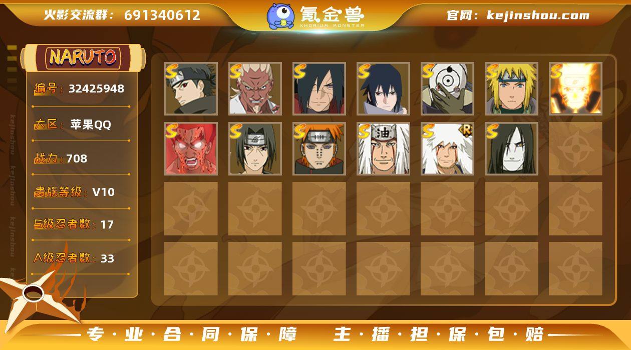 V10 17S忍 33A忍 16通灵 708.3W战力 可二次 可修改实名 【S级忍者】宇智波止水「须佐能乎」,艾「忍界大战」,宇智波斑「秽土转生·解」,宇智波佐助「永恒万花筒」,漩涡鸣人 「九喇嘛连结」,迈特凯「死门」,自来也 「舞之豪杰」,旗木卡卡西「须佐能乎」,大筒木舍人 「最终章」,漩涡鸣人 「暴怒·第六尾」,漩涡鸣人·宇智波佐助,宇智波斑「白面具」,宇智波鼬 「须佐能乎」,佩恩「天道」,波风水门,大蛇丸,自来也 【通灵兽】熊猫