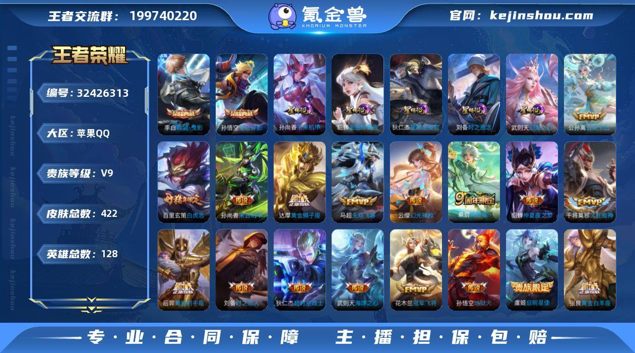AL691423 【学生党专属:低价成品号,段位皮肤够用,上手能上分】 皮肤数211 传说皮肤数12 星传说皮肤数2 史诗皮肤数48 英雄数125 营地id1740976994 贵族等级【文本】贵族8级 【贵族8级】 星元皮肤2 荣耀典藏4 内测皮肤2 年限皮肤2 限定皮肤49 赛季限定20 史诗皮肤49 战令限定9 勇者皮肤103 其他皮肤42 星元皮肤:孙悟空幽冥火,宫本武藏幽冥之眼; 荣耀典藏:小乔天鹅之梦,花木兰九霄神辉,铠银白咏叹调,伽罗最初的交响; 内测皮肤:艾琳女武神,姬小满妄想食味; 年限皮肤:妲己愿照众生和,澜愿照九州拓; 限定皮肤:少司缘巫礼祀神,艾琳女武神,女娲万灵启世,梦奇顽趣,西施织梦人,鬼谷子克喵,白起死霸装,姬小满小满鸭,虞姬启明星使,阿古朵布丁狗之约,钟馗虚灵犬护,苏烈春野闲踪,狄仁杰鹰眼统帅,阿轲化蝶舞,嫦娥暖冬兔眠,妲己灵卜魔法,暃星界游侠,曹操夜都魔契,后羿千劫归真,狄仁杰魔术师,孙膑茶境仙,马超访茗客,妲己愿照众生和,赵云皇家上将,项羽海滩派对,澜愿照九州拓,雅典娜黎明之约,太乙真人谧流熔炉,牛魔星界战将,桑启鸣野蒿,东皇太一噬灭天穹,盘古敬我三分,姬小满妄想食味,姜子牙天穹之誓,刘邦剑破天穹,沈梦溪龙舞盛年,鬼谷子天穹祈灯,张良古海寻踪,鲁班大师探海日志,狄仁杰阴阳师,裴擒虎擒涛扼浪,桑启海盐诗旅,甄姬落雪兰心,钟无艳超时空战士,鬼谷子五谷丰年,李元芳云中旅人,沈梦溪大漠名商,兰陵王金庭之子,达摩沙漠行僧; 赛季限定:项羽九幽镇关,梦奇顽趣,亚瑟荣光之誓,甄姬逆浪荇歌,钟馗虚灵犬护,雅典娜黎明之约,太乙真人谧流熔炉,牛魔星界战将,东皇太一噬灭天穹,姜子牙天穹之誓,刘邦剑破天穹,鬼谷子天穹祈灯,张良古海寻踪,鲁班大师探海日志,裴擒虎擒涛扼浪,桑启海盐诗旅,李元芳云中旅人,沈梦溪大漠名商,兰陵王金庭之子,达摩沙...