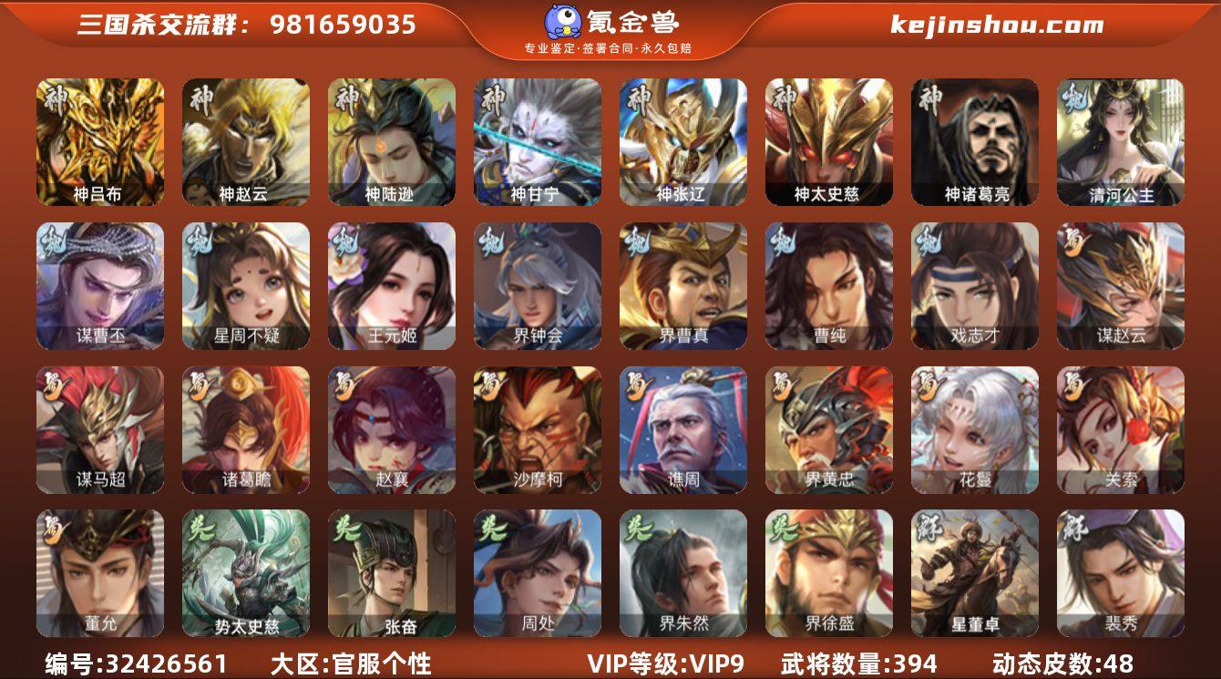 【2571】官阶:大将军;VIP等级:VIP9;史诗武将数量:46;动态皮肤数量:48;武将总数:394;史诗宝珠数量:39;将魂数量:2495;神将:9;魏国史诗武将:34;蜀国史诗武将:10;吴国史诗武将:5;群史诗武将:16