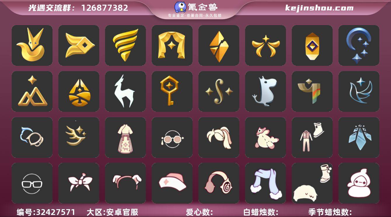 账号类型: 手机账号 季节已毕业: 小王子季,风行季,潜海季,表演季,破晓季,欧若拉季,夜行季,追忆季,拾光季,归巢季,九色鹿季,筑巢季,二重奏季,姆明季,彩染季,青鸟季,双星季,迁徙季 完成地图: 晨岛,云野,雨林,霞谷,暮土,禁阁,全图毕业 珍稀物品: 白枭,透明蝶翼斗,玫瑰花 礼包: 蝙蝠套,巫师,围巾,星球斗,小狐狸,欧若拉之翼,九色鹿角,莲花斗,音乐桌,大耳狗抱枕,大耳狗装扮,大耳狗服饰,绊爱,大铁头,鹿角,荷叶伞,蜘蛛斗,牛仔裤,兔子鞋,大耳狗发饰,肯德基联动,运动鞋,秋千,茶桌,茶壶,餐桌,白绒金,瑞雪,女巫裙,福娃,跷跷板,小船,吉他,灯笼,风之旅人,奔跑裤子,致爱装扮,人声乐器,奔跑发型,鲤鱼套,彩虹帽,雪花球,绒帽,橘子,粽叶,贝壳,黄伞,红伞,兔子,南瓜,枯角,雪花,鲤鱼,竖琴,手碟,电吉他,tgc,水母,猫套,猫背饰,星月头饰,彩虹耳钉,彩虹耳机,雪怪斗,球赛门,新年裤,蝴蝶结,魔法棒,奥利奥,海螺,四叶草,暗彩装扮,向日葵套,小提琴,拖鞋,滑板,爱心眼镜,火焰眼镜,伯爵斗篷,透明蛛丝,伯爵面具,飞蛾套,文雀套,雪人鞋,夹袄斗,新年耳钉,龙纹斗,浪漫流星斗,创始人,海蓝波浪发型,飞鸟纸伞,彩虹泡泡机,日光耳环,遥鲲披肩斗篷,满月耳坠,月华套装,锦标赛短袍,锦标赛桂冠,线框斗,优雅三件套,姆明饰品套装,...