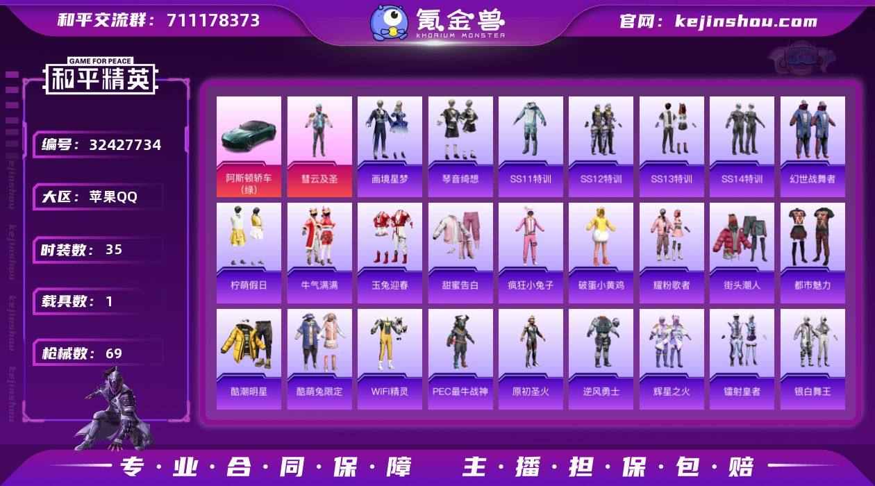 不可二次 苹果 手Q-1粉装-1特效枪-1载具-0粉色飞行器-17818热力值-1王牌印记-35套装-69枪皮 QW2631612 【粉色套装】:粉装-彗云及圣 【粉色枪皮等级】:Mk14-福马献瑞(四级) 【粉色载具】:阿斯顿马丁DBS(绿) 【粉色枪皮】:Mk14-福马献瑞 【粉色降落伞】:百万伏特降落伞,妙趣可丽降落伞,闪光银龙降落伞 【稀有套装】:套装-雪国风尚,套装-马上有钱,套装-画境星梦,套装-琴音绮想,角色-霜刃之御 【稀有枪皮】:AKM-星之彼岸,AKM-破晓战魂,AKM-龙的传人,M16A4-幻世战舞者,SCAR-L-夜灯,SCAR-L-炫彩节奏,SCAR-L-红色方程式,SCAR-L-黄金龙骨,M416-红色方程式,GROZA-黑色刀锋,GROZA-暮色玫影,AUG-天降萌叽,AUG-耀粉歌者,QBZ-原初圣火,M762-牛气冲天,M762-镭射皇者,ACE32-画境星梦,UZI-古堡领主,UMP45-怪兽之王,UMP45-生命誓言,UMP45-极意拳锋,Vector-彩虹符号,Vector-生命誓言,汤姆逊-天降萌叽,MP5K-繁花小夜曲,MP5K-画境星梦,P90-闪光银龙,Kar98K-PEC最牛战神,Kar98K-古堡领主,Kar98K-红色方程式,SKS-糯团青竹,VSS-星之彼岸,VSS-镭射皇者,VSS-虎痴许褚,Mini14-原初圣火,Mini14-炫彩节奏,Mini14-耀粉歌者,M1加兰德-画境星梦,S686-生...