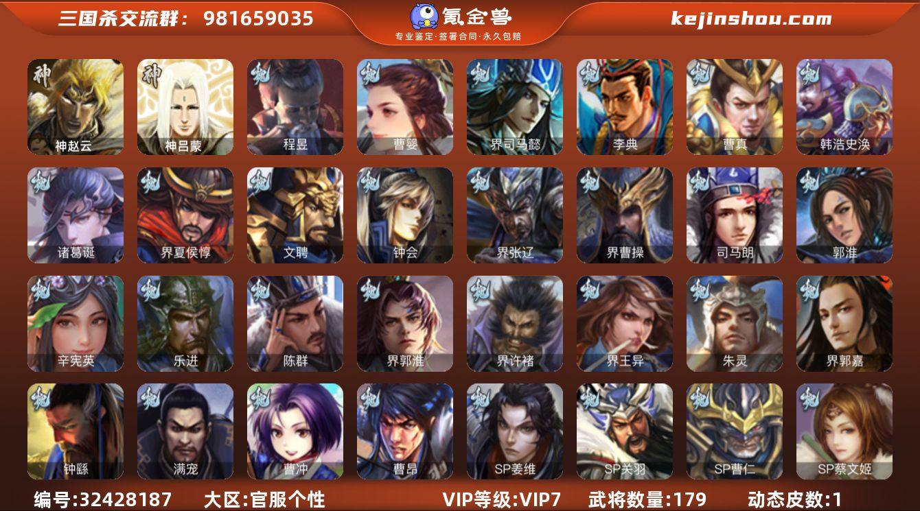 6史诗中军,8.8万羽毛,6200将魂,大宝界徐盛,神赵云,曹婴,带皮沮授,花鬘,程昱6史诗,神吕蒙,sp赵云,动态界吕布,鲁肃,sp曹仁,关银屏,界关羽,界马超,界孙休,孙茹,凌操,谋小乔,谋卢植,谋高顺,张布,势田丰,金皮界王异,金皮刘封179将,国战63将,7万4豆,满级活树