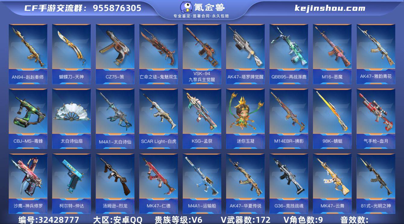 【编号04325 可秒换绑】店长推荐特价处理精品号10英雄角色数-162英雄武器数 【王者系列】:王者之影,王者之狱 【热门武器】:KSG-孟获,AK47-元让,81式-光明之神,MK47-仁德,81式-阿波罗 【角色】:萝拉,葵,幽灵刀锋-觉醒,樱,瞳,关小雨,职场灵狐-赛事经理*2,炽天使-X,零-新生 【英雄武器】:AK47-无影,AK47-火麒麟,AK47-幸运日觉醒,AK47-猩红传说,AK47-沙漠郡主-超觉,AK47-雷麒麟,AK47-血武士,AK47-华夏传说,AK47-春雅觉醒,AK47-木兰,AK47-元让,AK47-雅韵青花,AK47-塔罗牌觉醒,AK47-谜城烟火,M4A1-雷神*2,M4A1-黑骑士,M4A1-死神,M4A1-龙血,M4A1-堕天神,M4A1-运输船,M4A1-千变,M4A1-太白诗仙,SCAR Light-白虎,SCAR-探星者,AN94-四凶觉醒,AN94-赳赳秦师,AUG-机械纪元,9A91-天神,M14EBR-拂影,M16-恶魔,QBZ03-死神,HK416-混世行者,81式-光明之神,G36-竞技战魂,MK47-云舞,MK47-仁德,AWM-天龙,AWM-裁决,巴雷特-毁灭*3,巴雷特-极光*2,09式狙-天神,98K-黑骑士,98K-星神,98K-蜻蜓,MR1-龙吟惊沧海,TAC-晴舞,VSK-94-九黎兵主觉醒,刘易斯-天使,QBB95-极光,QBB95-再战涿鹿,MK5-极光,汤姆逊-烈龙*2,QCW05-竞界荣光,QCW05-...
