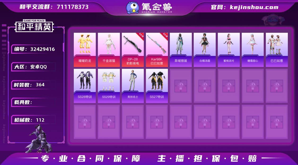 【特价出售】安卓Q-2粉装5特效枪3热门91套装112枪皮 31332热力值 11印记 历史卓越王牌19星 【2粉装】 暖暖奶龙 千金淑猫 【5特效枪】 Kar98K-巳巳如意 (5级) DP-28-豹影疾电 (5级) Mk14-樱桃泡泡 (6级) Mk14-福马献瑞 (5级) ACE32-萌骑漫游 (4级) 【3热门】 龟仙人 破蛋小黄鸡 极速红龙