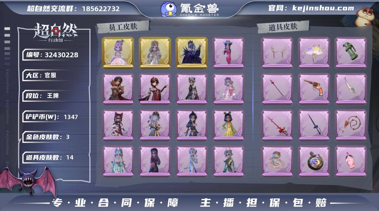 【Q1462】【段位】超自然传说 【幻梦皮肤数量】0 【星耀限定皮肤数量】0 【金色皮肤数量】3 【紫色皮肤数量】15 【道具皮肤数量】20 【铲铲币】461w 【累充】14030金砖 【赛季魔盒】普通魔盒 【员工】小黄、爱丽丝、零、阿念、逍遥、薇薇安、巫铃儿、莉莉、艾伦、爱德华、兰、小满、临云 【金色皮肤】莉莉-瑶台梦、逍遥-莲华渡、薇薇安-圣光之谕 【紫色皮肤】艾伦-黎明猎手、临云-织锦云程、阿念-庆宴绮愿、爱丽丝-耀眼的你、兰-千夜星谕、阿念-迷途僵宝、莉莉-除妖小师妹、薇薇安-黑月挽歌、阿念-王子与骑士、薇薇安-白光莹、零-青云逸歌、巫铃儿-素影瑶光、爱丽丝-丝缕哀歌、逍遥-绣春逍影、小黄-呱呱雨衣 【道具皮肤】摸金符-祝祷词、腰包-宝剑八、长鞭-缚誓之锁、长鞭-飞天绫、桃木剑-永眠曲、急救包-蔷薇物语、铲子-龙鳞、刺刀-碧络琅环、电击枪-甜蜜泡泡枪、转轮手枪-新星时代、短管猎枪-星光的裁决、铲子-圣心之泪、刺刀-紫气东来、闪光弹-金戈玄铜、额外的背包-飞花令、腰包-月下莲台、音响-鸣沙鼓、背饰-梵音莲华、背饰-天使的呼唤 【头饰】饺饺者、马上有钱、烛光纪念、蒜了八、精致露比头套、小财神豚豚头套、鱼头怪头套、烈焰红唇头套、大葱明头套、火爆了头套、面具马头套、哈士奇头套、萨卡班甲鱼头套、嘻嘻头套、滑稽头套、呆滞头套、卑微头套、鳄霸天头套、驼半仙头套、炙热烧烤、像素朋克墨镜、后室幸存者头套 【挂饰】孤独对望、天使消失的年代、钗头凤 【动作】新年摇、知世摇、luvaboy、心跳摇、舞台中心、姬芽摇、拜年、蝴蝶步、山楂树之舞、律动迪斯科、举牌、抬手、旋转舞、KT猫摇