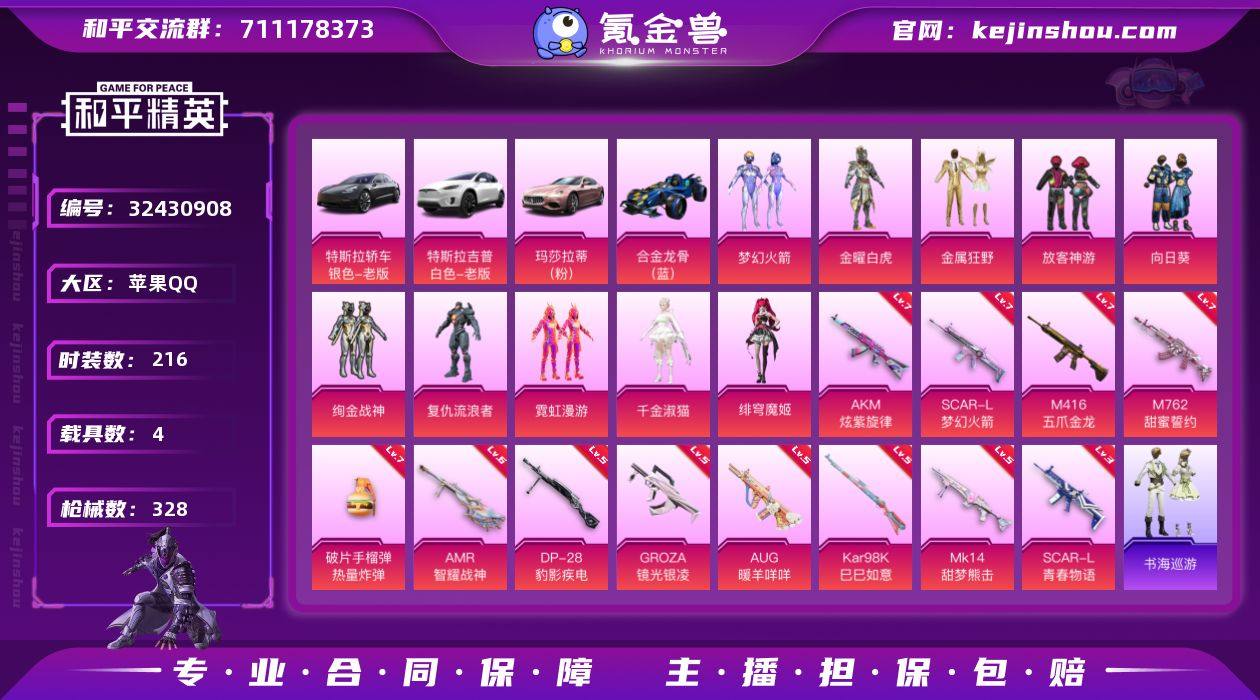 【kyhp1044】苹果 手Q-11粉装-12特效枪-4载具-6粉色飞行器-108955热力值-20王牌印记-216套装-328枪皮 【热门品类】:粉装-梦幻火箭,套装-浪漫波比,套装-红熊茄茄 【粉色套装】:粉装-金曜白虎,粉装-梦幻火箭,粉装-金属狂野,粉装-放客神游,粉装-向日葵,粉装-绚金战神,角色-复仇流浪者,粉装-霓虹漫游,角色-千金淑猫,角色-绯穹魔姬,角色-罪夜之冕 【粉色枪皮等级】:AKM-炫紫旋律(七级),SCAR-L-梦幻火箭(七级),SCAR-L-青春物语(三级),M416-五爪金龙(七级),GROZA-镜光银凌(五级),AUG-暖羊咩咩(五级),M762-甜蜜誓约(七级),Kar98K-巳巳如意(五级),Mk14-甜梦熊击(五级),AMR-智耀战神(六级),DP-28-豹影疾电(五级),破片手榴弹-热量炸弹(七级) 【粉色载具】:特斯拉Model 3(冷光银),特斯拉Model X(珍珠白),玛莎拉蒂Ghibli(粉),合金龙骨(蓝) 【粉色枪皮】:AKM-炫紫旋律,SCAR-L-梦幻火箭,SCAR-L-青春物语,M416-五爪金龙,GROZA-镜光银凌,AUG-暖羊咩咩,M762-甜蜜誓约,Kar98K-巳巳如意,Mk14-甜梦熊击,AMR-智耀战神,DP-28-豹影疾电,破片手榴弹-热量炸弹 【粉色飞行器】:绝对恒星飞行器,炫彩糖果飞行器,梦幻火箭飞行器,炫紫旋律飞行器,镜光...