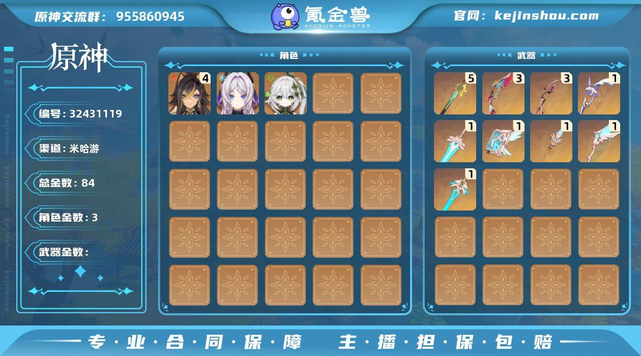 邮箱: 不送邮/死邮 总黄数: 202 冒险等级: 60 6命金色角色: 满命七七,满命刻晴,满命莫娜,满命琴,满命雷电将军,满命夜兰,满命提纳里,满命流浪者,满命迪希雅,满命莱欧斯利,满命阿蕾奇诺,满命恰斯卡 4命金色角色: 四命迪卢克 2命金色角色: 二命枫原万叶,二命纳西妲,二命那维莱特,二命芙宁娜,二命娜维娅,二命闲云,二命克洛琳德,二命希诺宁 1命金色角色: 一命可莉,一命胡桃,一命申鹤,一命梦见月瑞希,一命丝柯克,一命菲林斯 0命金色角色: 温迪,神里绫华,宵宫,达达利亚,钟离,珊瑚宫心海,八重神子,神里绫人,赛诺,白术,林尼,千织,玛薇卡,伊涅芙,哥伦比娅 拥有武器: 狼的末路,雾切之回光,飞雷之弦振,四风原典,天空之卷,阿莫斯之弓,天空之傲,风鹰剑,天空之脊,护摩之杖,薙草之稻光,不灭月华,苍古自由之誓,终末嗟叹之诗,冬极白星,息灾,神乐之真意,波乱月白经津,若水,猎人之径,赤沙之杖,千夜浮梦,图莱杜拉的回忆,裁叶萃光,苇海信标,碧落之珑,最初的大魔术,万世流涌大典,金流监督,静水流涌之辉,裁断,鹤鸣余音,有乐御簾切,赤月之形,赦罪,白雨心弦,岩峰巡歌,星鹫赤羽,焚曜千阳,苍耀,支离轮光,帷间夜曲 5精武器: 图莱杜拉的回忆,金流监督 3精武器: 不灭月华 2精武器: 狼的末路,雾切之回光,飞雷之...
