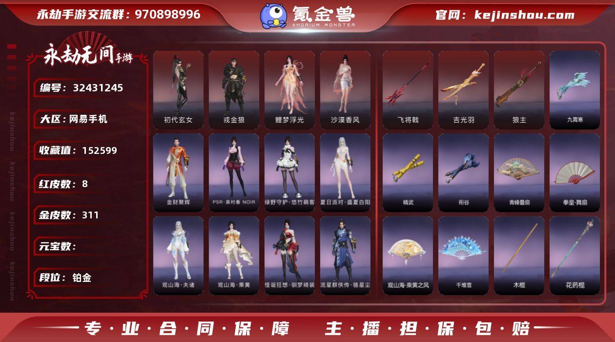0AXFBQ网易手机7个红皮,戎金狼(特木尔),初代玄女(宁红夜),鲤梦浮光(胡桃),沙漠香风(迦南),飞将戟(斩马刀),吉光羽(太刀),狼主(阔刀),